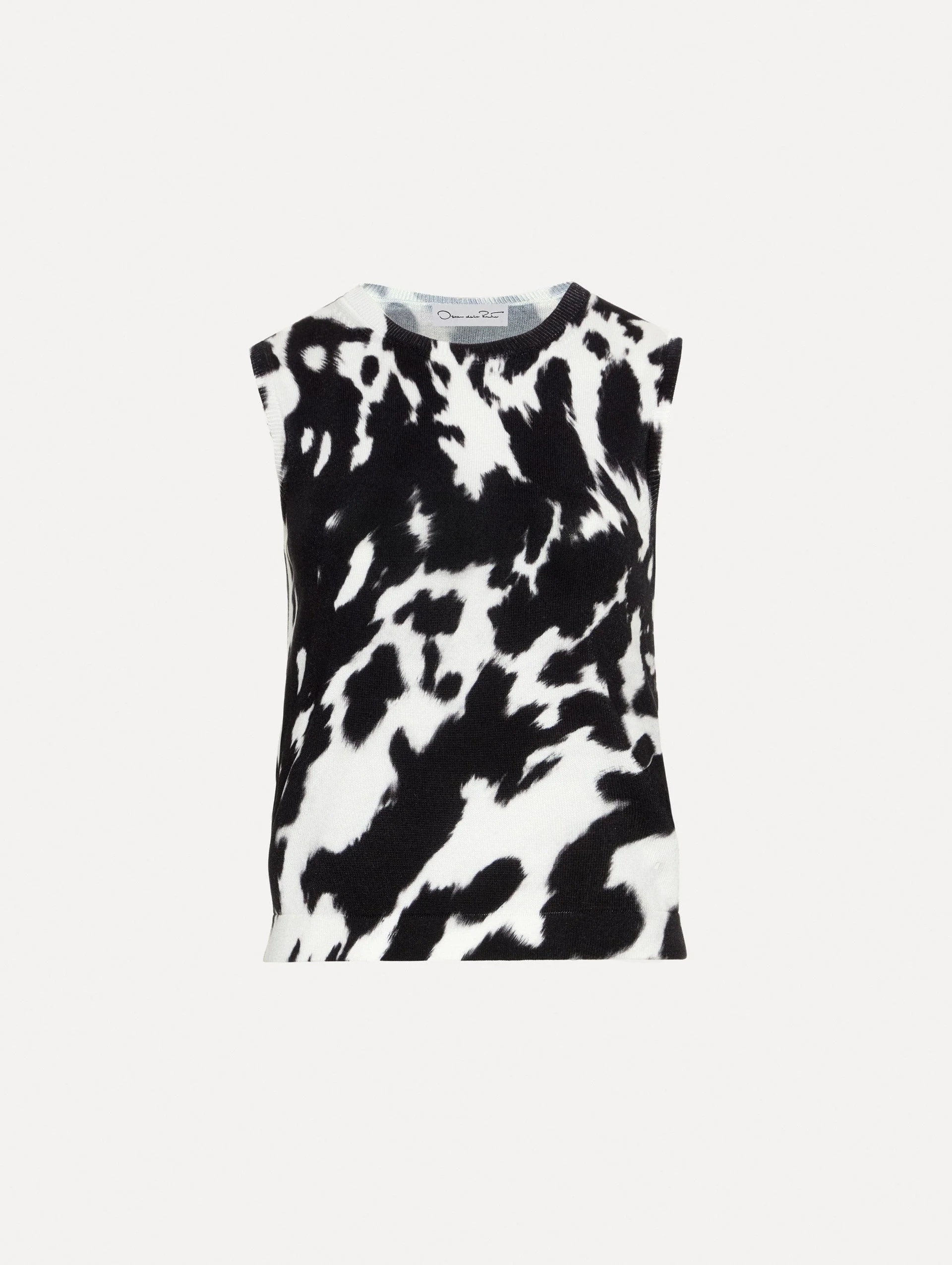 This classic ribbed-knit tank is printed with a distinctive cow motif. Cut in a form-fitting silhouette, this style features a crew neckline and banded trim. Wear alone for a sleeveless statement or pair with its coordinating cardigan for optimal versatility. Details - Sleeveless - Crew Neckline - Pullover Style - Ribbed Trim - Unlined - Style Code: 25FN126WOC_BLI - Country of Origin: Italy Materials & Care - - 57% Cotton, 43% Viscose - - Dry clean only.