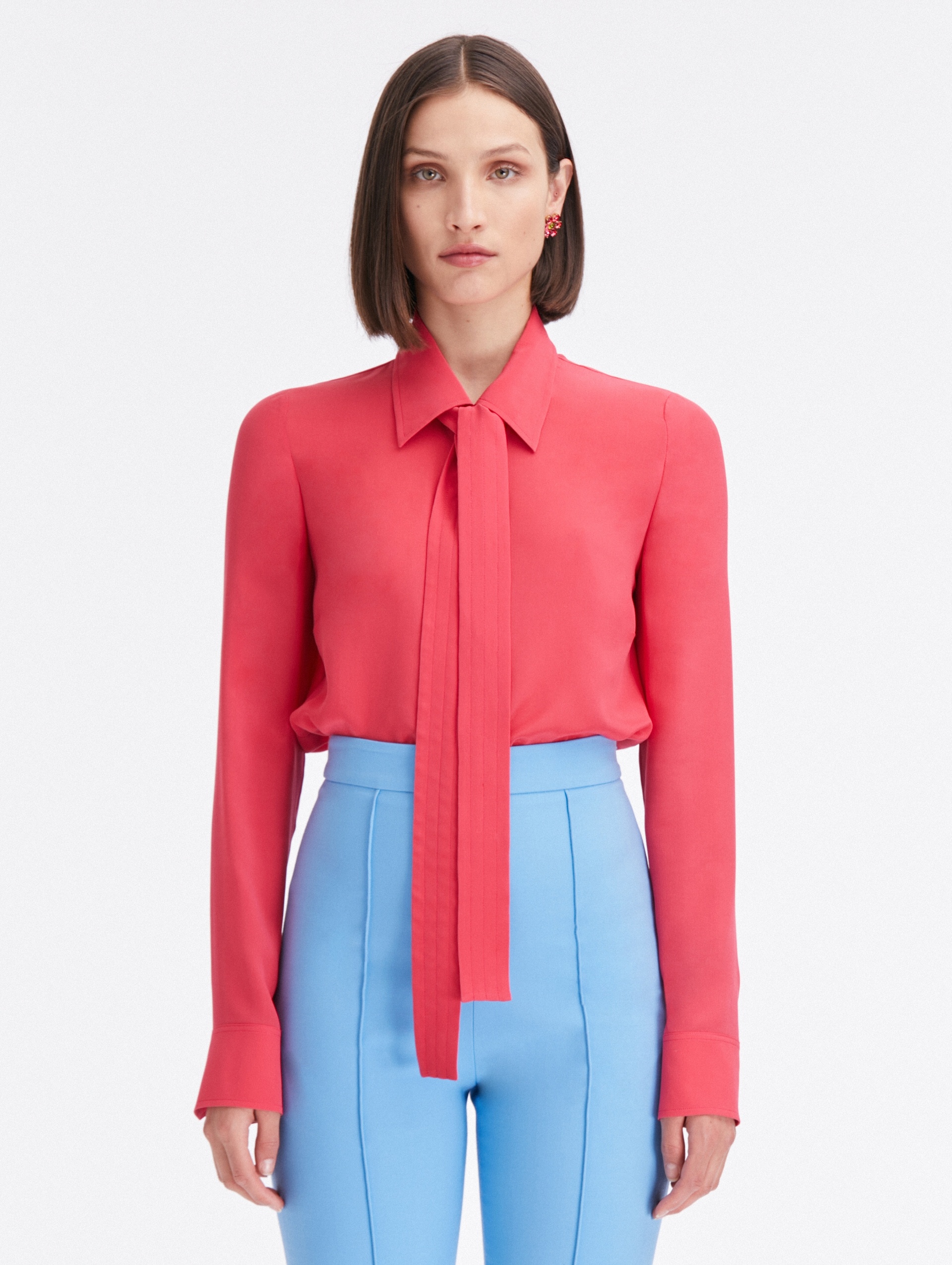 WHETHER OFFICE BOUND OR EVENT READY, THIS SILK CREPE DE CHINE BLOUSE WILL LEND A POP OF COLOR TO YOUR CLOSET. THIS TOP FEATURES A CLASSIC SHIRT COLLAR WITH A SELF-TIE DETAIL FOR ADDED FLARE. LONG SLEEVES / SHIRT COLLAR WITH SELF-TIE NECK / BUTTON FRONT / SEMI-SHEER / DRY CLEAN DIMENSIONS: MODEL IS 5'10.5" / 180 CM AND WEARING SIZE 2 MATERIAL: 100% SILK MADE IN ITALY STYLE 24RN719CCN_CER