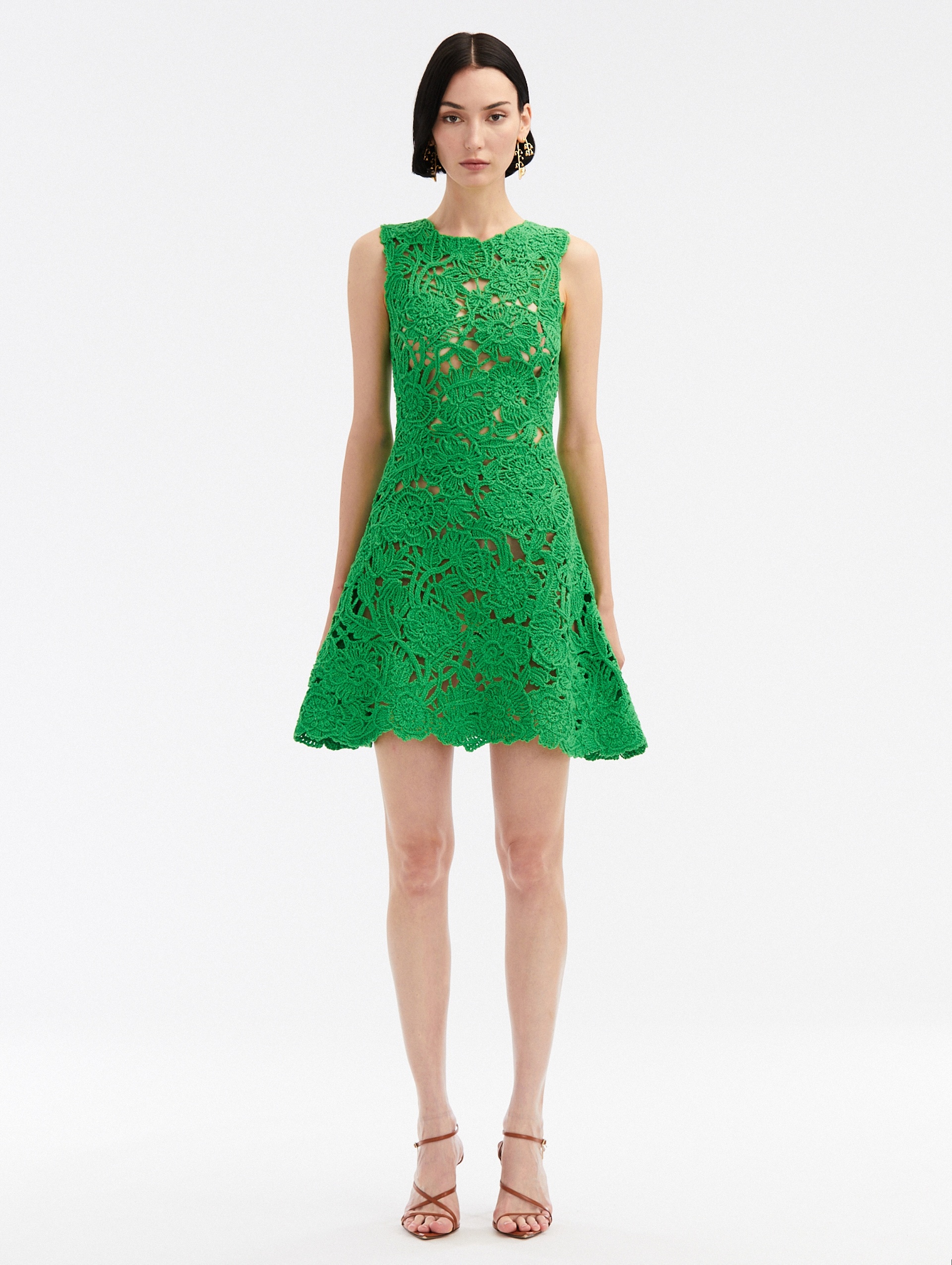 WITH THE CRAFTSMANSHIP KNOWN TO THE HOUSE OF OSCAR DE LA RENTA AT THE FORE, THIS BIRDSNEST CROCHET KNIT DRESS SHOWCASES THIS COLLECTION'S HERO FLOWER, THE POPPY. FEATURING A SOFTLY FLARED SKIRT AND LEG-BARING HEMLINE, THIS DRESS IS BEYOND THE ORDINARY. SLEEVELESS / A-LINE SILHOUETTE / MID-THIGH LENGTH / SEMI-SHEER / KEYHOLE BACK WITH SELF-TIE CLOSURE / DRY CLEAN DIMENSIONS: MODEL IS 5'10" / 180 CM AND WEARING SIZE S MATERIAL: 100% COTTON MADE IN ITALY STYLE 24SN198BNC_CUS