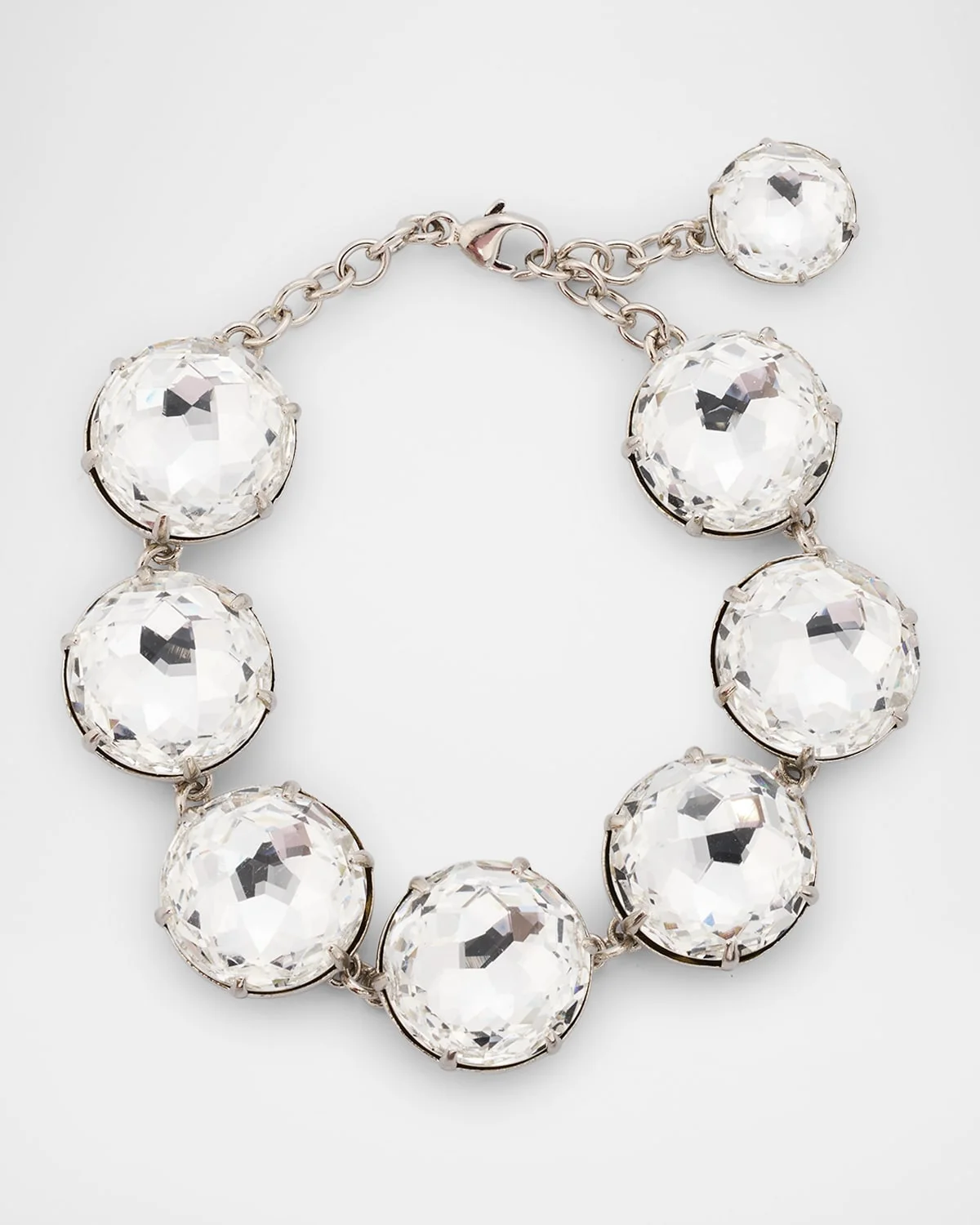 - Rose-cut glass crystals are linked for this Oscar de la Renta bracelet. A smaller crystal finishes the bracelet while hanging from the extension chain. - Silvertone brass with a shiny finish - Adjustable length - Lobster clasp - Made in Italy