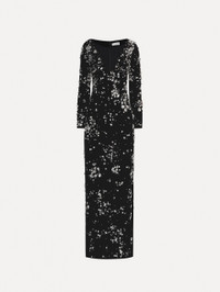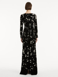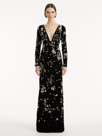 Composed of multi-dimensional stones and scattered across a canvas of deep black velvet, faceted crystal clusters shimmer like constellations in motion—an effect that brings celestial allure to this long-sleeve evening gown, defined by its plunging V-neckline and sleek column silhouette. This piece is a result of 215 hours of meticulous handwork, with 4,000 stones, crystals and beads individually set by skilled artisans. Details - Long Sleeves - V-Neckline - Column Silhouette - Concealed Back Zipper - Center Back Slit - Lined - Style Code: 25FE024CPV_SLB - Country of Origin: USA Materials & Care - - 65% Polyester, 35% Cupro; Lining: 94% Silk, 6% Elastane - - Spot clean only. - - Do not dry clean, iron, steam, bleach, or wash.