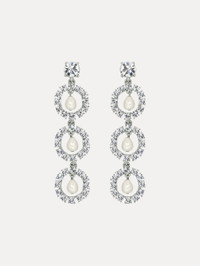 These glamorous drop earrings feature three stacked glass crystal discs, each with a delicate pearl suspended at its center. The shimmering glass crystals and luminous pearls create an elegant, cascading effect. Details - Post Backs - For Pierced Ears - European Crystal Glass - Style Code: S25J128_SIL - Country of Origin: Italy Materials & Care - 94% Brass, 5% Strass, 1% Plastic