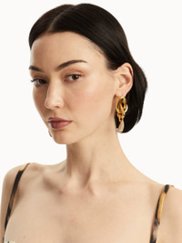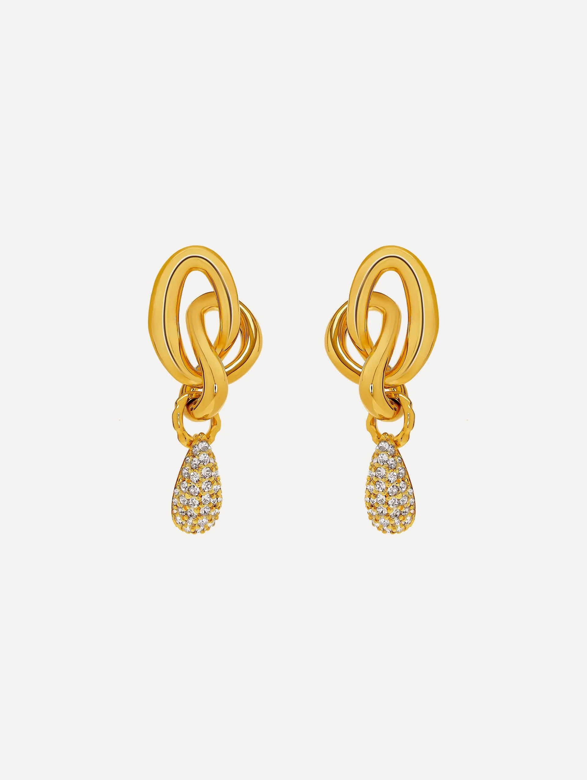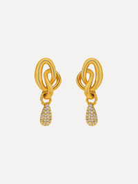 These gold earrings are delicately knotted into a fluid, sculptural design, subtly evoking the interlocking Oscar 'O' emblem in an abstract form. A delicate teardrop, adorned with pave crystals, elegantly suspends beneath. Details - Dimensions: 65 mm x 27 mm - Weight: 30 grams - Post Backs - For Pierced Ears - Style Code: P25J907_GOL - Country of Origin: Italy Materials & Care - 63% Copper, 30% Brass, 1% Bronze, 5% Glass, 1% Gold