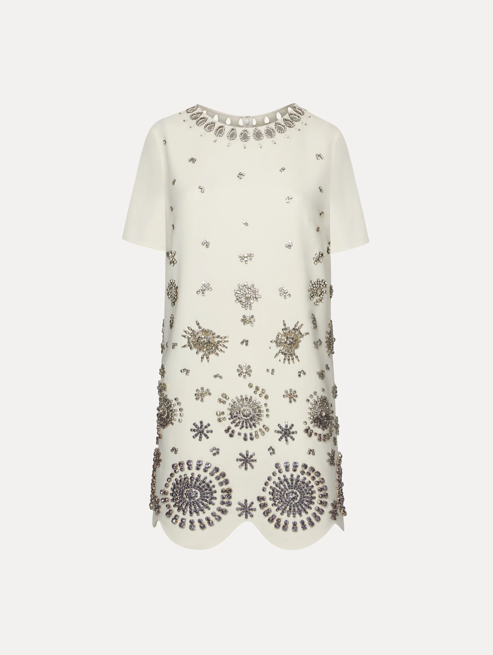 Cut from double-faced stretch wool in a soft shade of ivory, this mini dress is enhanced by intricate crystal medallion embroideries, adding dimension and detail. Cut in Oscar de la Renta's signature shift silhouette, this dress is finished with short sleeves and scallop trim. Details - Sleeveless - Jewel Neckline - Shift Silhouette - Concealed Back Zipper - Scallop Trim - Unlined - Style Code: 25PE620DSW_IVR - Country of Origin: India Materials & Care - 94% Virgin Wool, 5% Elastane, 1% Polyamide