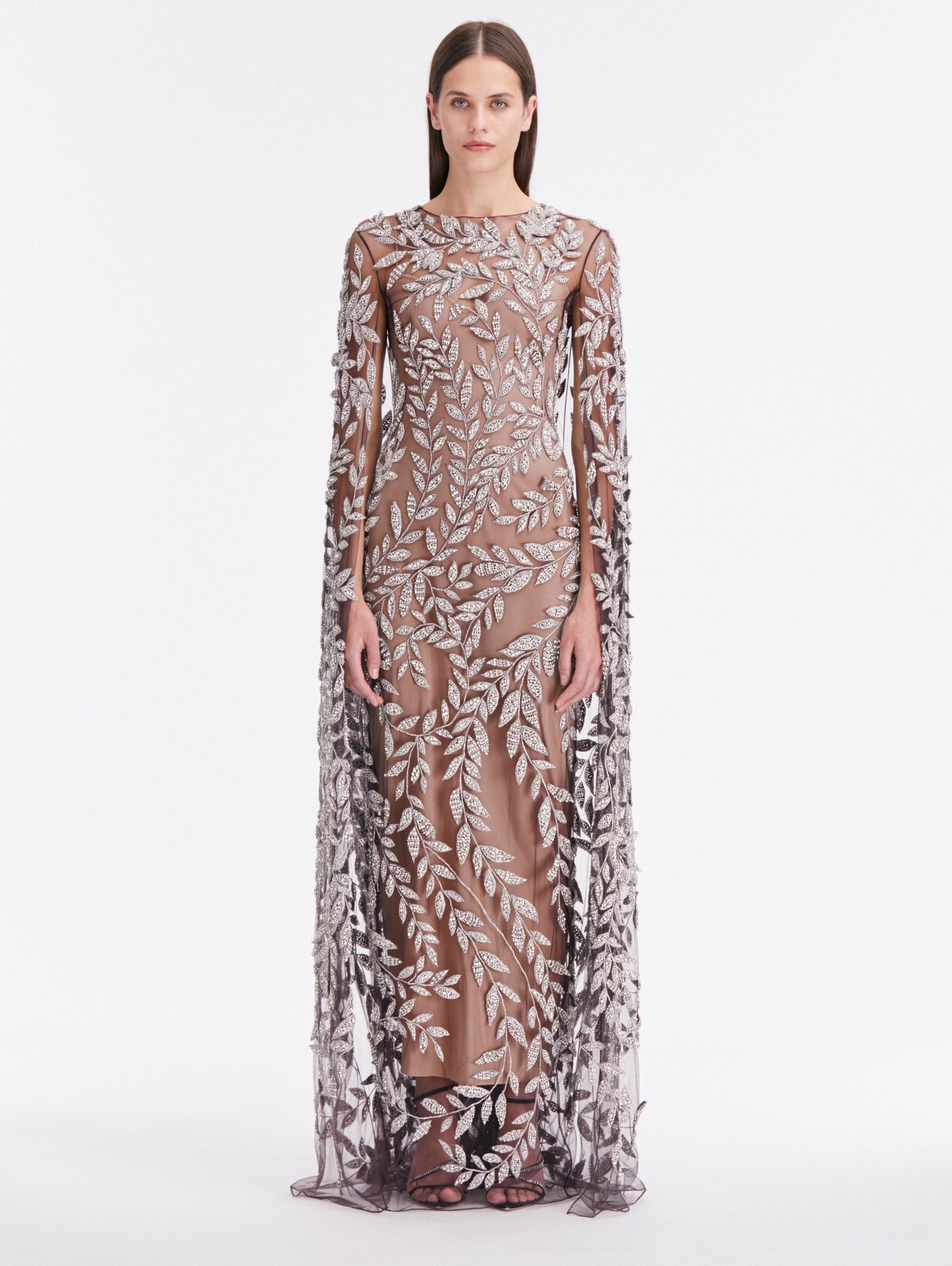 BRILLIANCE TAKES CENTER STAGE WITH THIS LIGHT-CATCHING TULLE CAFTAN. CRYSTAL EMBROIDERED LEAVES ADORN EVERY INCH OF THIS SHOW-STOPPING PIECE WITH LONG CASCADING SLEEVES. EXAGGERATED LONG SLEEVES / RELAXED SILHOUETTE / FLOOR-SWEEPING HEMLINE / BACK ZIPPER / LINED / DRY CLEAN DIMENSIONS: MODEL IS 5'10" / 180 CM AND WEARING SIZE S MATERIAL: BASE/FRAME/LINING: 100% POLYAMIDE MADE IN INDIA STYLE 24RE903TUL_EPR