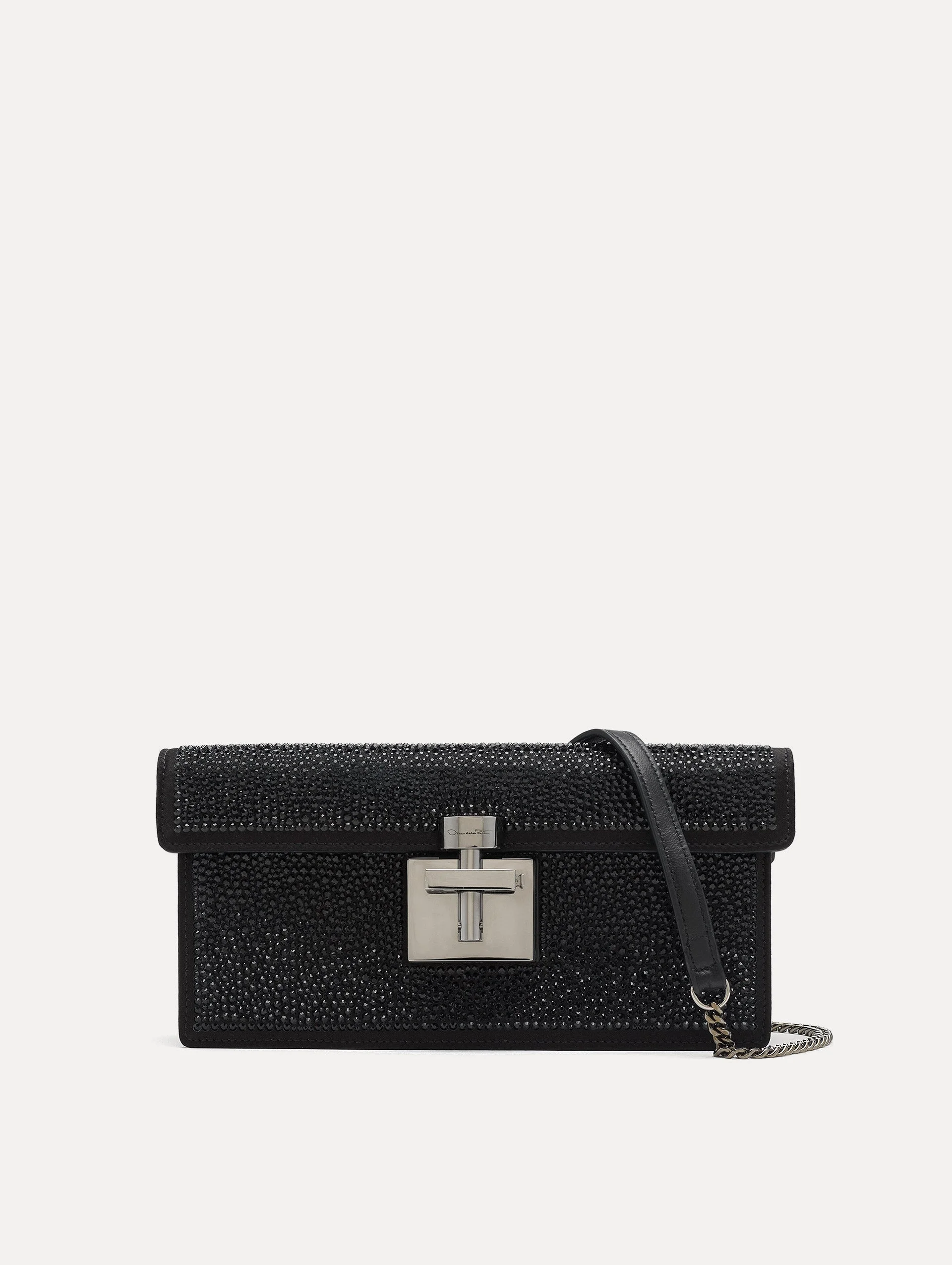 CAPTURE OSCAR DE LA RENTA'S SIGNATURE TAKE ON GLAMOUR WITH THIS LUXE ALIBI CLUTCH. THIS SLIM DESIGN IS CRAFTED FROM BLACK SATIN AND COVERED ENTIRELY WITH PAVE CRYSTALS. CARRY IT IN HAND OR ATTACH THE LONGER STRAP. DETACHABLE SHOULDER STRAP / PUSH-LOCK CLOSURE / SPOT CLEAN DIMENSIONS: 4.7IN X 9.6IN X 2IN MATERIAL: 90% SATIN(68%VI / 32% SE) 10% LAMB LEATHER MADE IN ITALY STYLE 23PH1051CRT_BLK