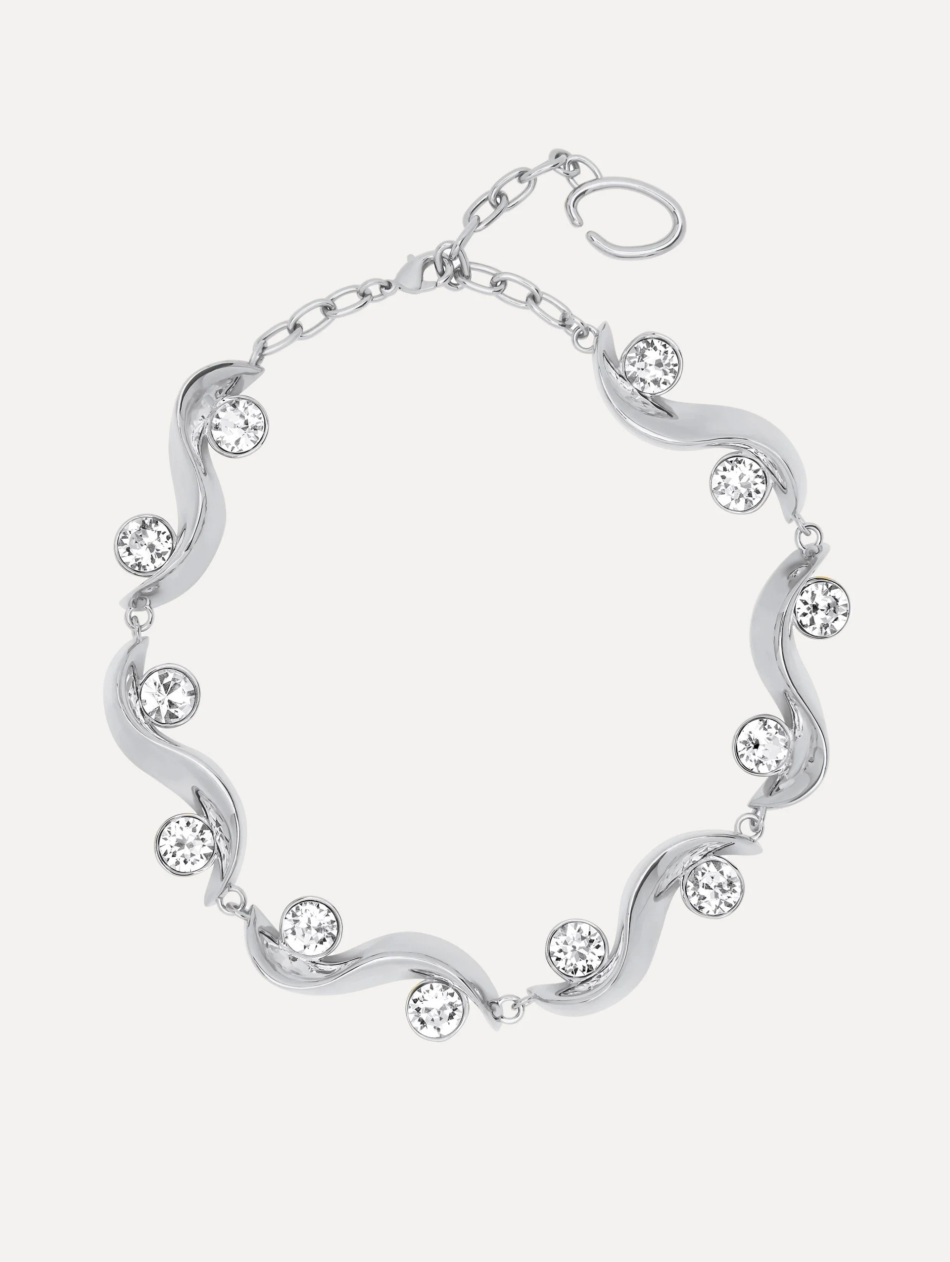 This sculptural necklace features polished gold-tone curves—each wave accented by a brilliant round crystal. Fluid and refined, it brings a sense of movement and light to any look. Details - Dimensions: 30 cm - Weight: 70 grams - Lobster Clasp / European Glass Crystals - Style Code: F25J802_SIL - Country of Origin: Italy Materials & Care - - 95% Brass, 3% Plastic Pearl, 2% Crystal Glass - - Avoid exposing your jewelry to harsh chemicals. - - Lotions, cosmetics, hairspray and perfumes can cause chemical reactions that can cause the finish to deteriorate. - - Before handling, washing hands after applying makeup and hair products will help to preserve the finish. - - Do not wear in the pool, on the beach or in the shower. - - Wipe away dirt and body oils with a slightly damp microfiber jewelry cloth or cotton ball and allow to dry. - - Store separately in cloth pouches or small boxes to minimize scratching.