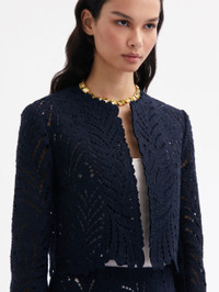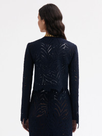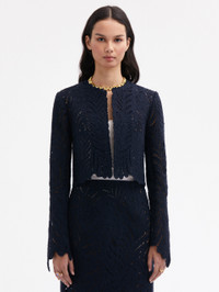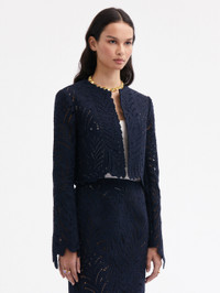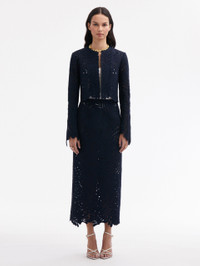 WITH THE CRAFTSMANSHIP KNOWN TO THE HOUSE OF OSCAR DE LA RENTA AT THE FORE, FERN EMBROIDERY UPDATES SIGNATURE TWEED STYLING. PAIR THIS JACKET WITH ITS COORDINATING SKIRT FOR A STATEMENT SURE TO STUN. HIGH WAISTED / BELOW THE KNEE LENGTH / PENCIL SILHOUETTE / CENTER BACK SLIT / CONCEALED BACK ZIPPER / DRY CLEAN DIMENSIONS: MODEL IS 5'10.5" / 180 CM AND WEARING SIZE 2 MATERIAL: 94% VIRGIN WOOL, 3% MOHAIR, 2% POLYAMIDE, 1% ELASTANE MADE IN ITALY STYLE 24PE517SOE_NAV