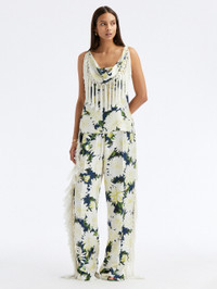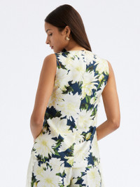 DAHLIAS BLOOM IN BRILLIANT SHADES OF IVORY AND NAVY OVER A BACKDROP OF SMOOTH SILK TWILL. A DRAPED NECKLINE GIVES WAY TO SWEEPING TASSELS, FOR ADDED FLARE. PAIR WITH ITS COORDINATING BLOUSE FOR A BOTANICALLY BRILLIANT STATEMENT. SLEEVELESS / SCOOP NECKLINE / HIP LENGTH / RELAXED SILHOUETTE / PULLOVER STYLE / HIP LENGTH / DRY CLEAN DIMENSIONS: MODEL IS 5'10.5" / 180 CM AND WEARING SIZE 2 MATERIAL: 100% SILK MADE IN ITALY STYLE 23PE728DSK_IVN