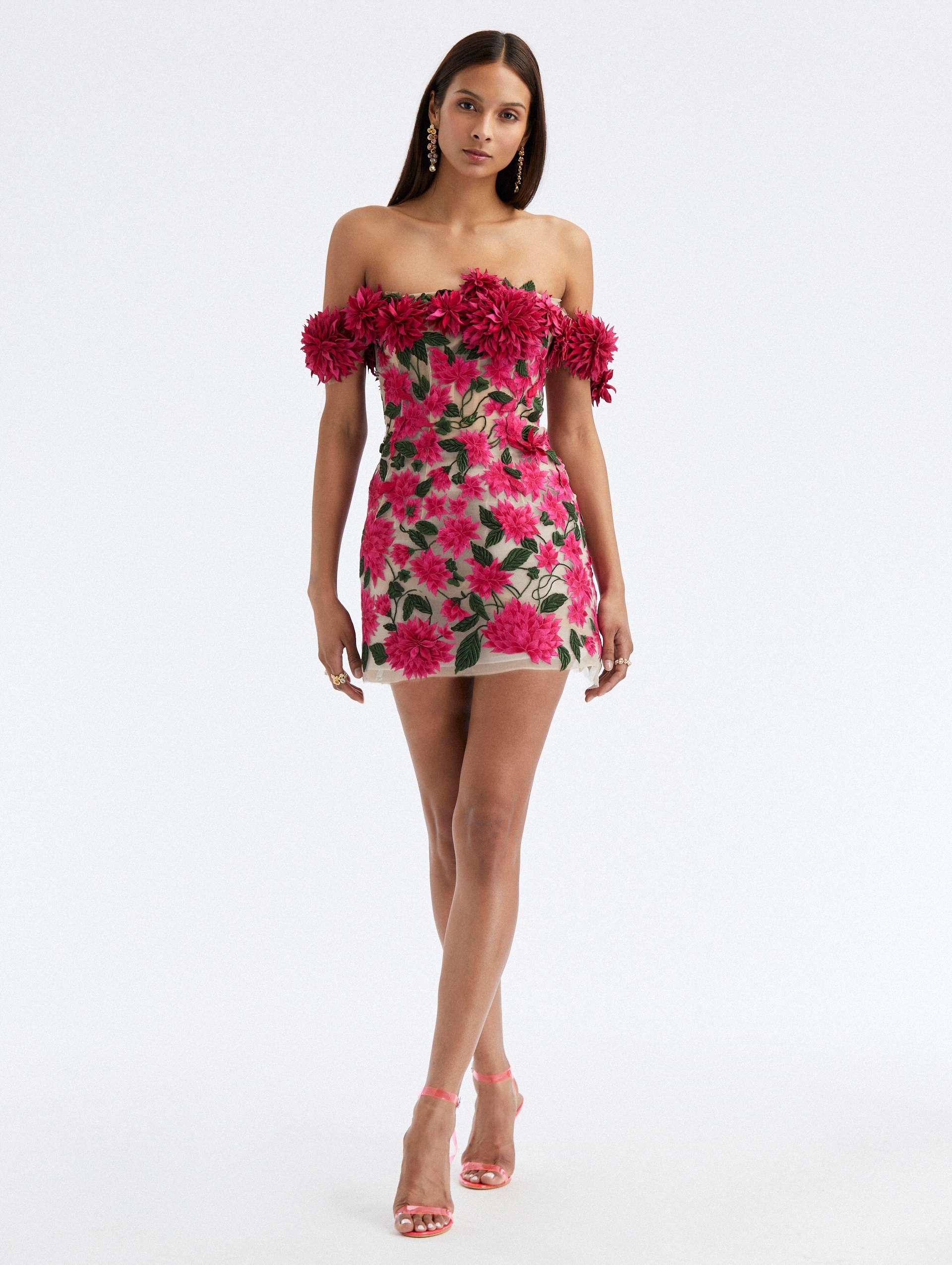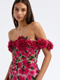 A ROMANTIC OPTION FOR UPCOMING OCCASIONS, THIS COCKTAIL MINI IS CRAFTED FROM DELICATE TULLE AND FEATURES DAHLIA THREADWORK EMBROIDERY WITH SILK APPLIQUES AT THE OFF-THE-SHOULDER NECKLINE. OFF SHOULDER / DROP SHORT SLEEVES / FITTED SILHOUETTE / MID-THIGH LENGTH / CONCEALED BACK ZIPPER / 100% SILK LINING / DRY CLEAN DIMENSIONS: MODEL IS 5'10.5" / 180 CM AND WEARING SIZE 2 MATERIAL: BASE: 100% POLYAMIDE; LINING: 100% SILK MADE IN USA STYLE 23PE642TUL_PKM