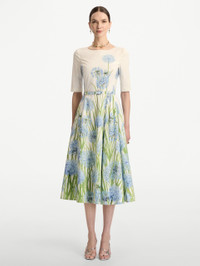 This cotton poplin dress captures the delicacy of nature in full bloom, featuring a degrade arrangement of allium blossoms that rise from hem to bodice in soft, painterly succession. The silhouette is defined by midi-length sleeves, a cinched waist with a matching belt, and a pleated skirt that moves with graceful volume. Details - Midi Sleeves - Jewel Neckline - Coordinating Buckle Belt - Side Seam Pockets - Concealed Back Zipper - 100% Cotton Lining - Country of Origin: Italy - Style Code: 26RN238ADP_BWE Materials & Care - 97% Cotton, 3% Elastane; Lining: 100% Cotton - Dry clean only.