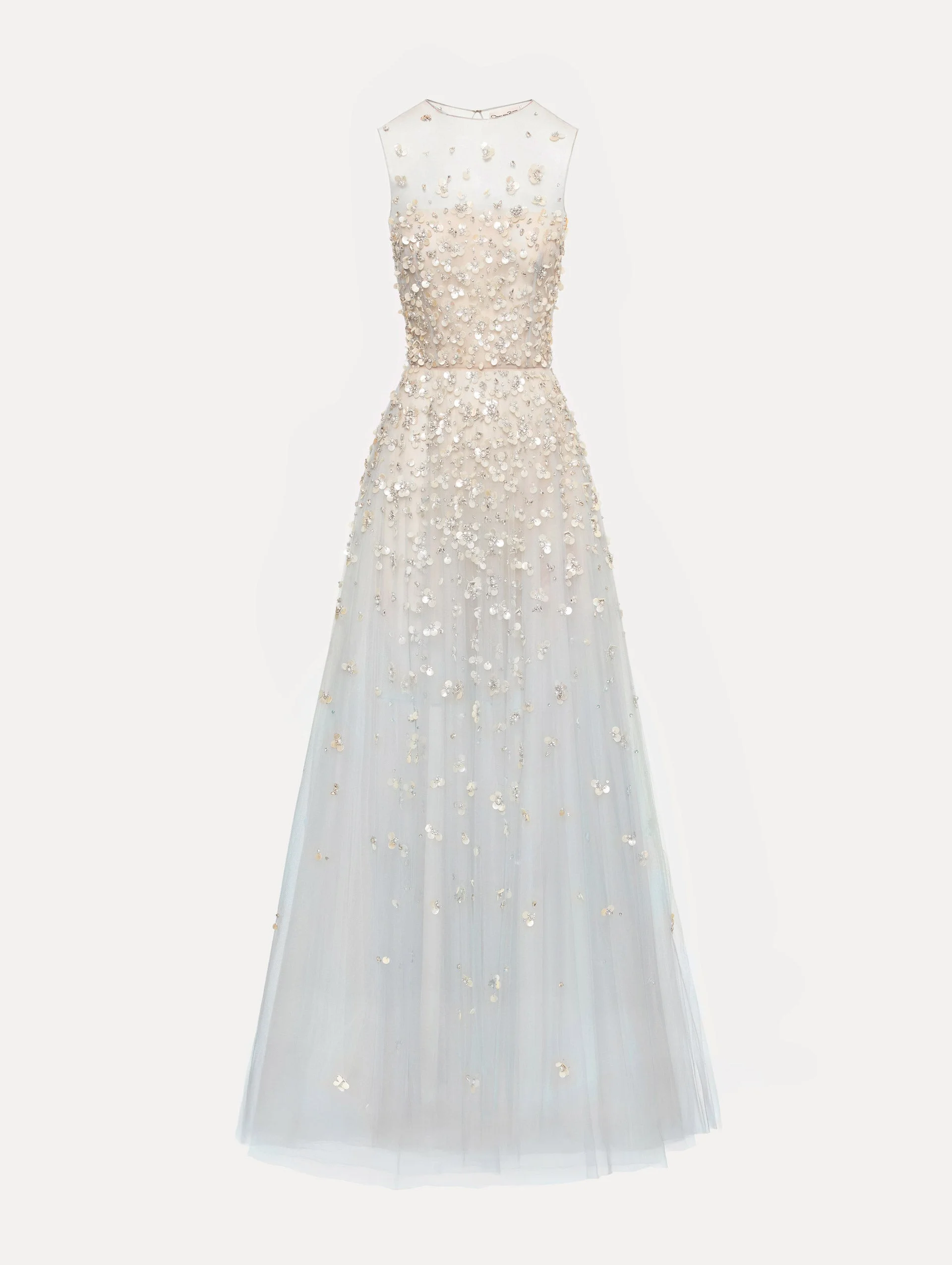 A study in ethereal craftsmanship, this gown is adorned with hand-applied blossoms of mother-of-pearl and crystals that drift weightlessly across sheer tulle. The illusion neckline enhances its lightness, while the softly flared skirt creates a graceful sense of movement. Details - Sleeveless - Illusion Neckline - Concealed Back Zipper with Keyhole Closure - Floor-Sweeping Hemline - 100% Silk Lining - Country of Origin: USA - Style Code: 26RE045TUL_SKY Materials & Care - 100% Polyamide; Lining: 100% Silk - Spot clean only - Do not dry clean, iron, steam, bleach, or wash