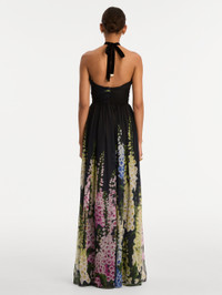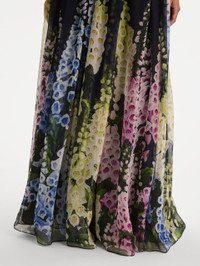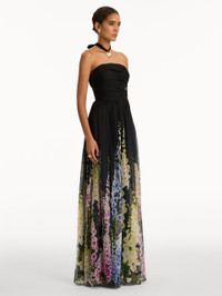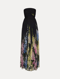 This gown flows with ethereal ease, its bodice releasing into a degrade foxglove print that blooms in a cascade of vivid color. The gathered waistline and floor-sweeping skirt create a romantic sense of movement, evoking a moonlit garden in full flourish. Details - Strapless - Floor-Sweeping Hemline - Concealed Back Zipper - 100% Silk Lining - Country of Origin: USA - Style Code: 26RN049MXN_NSM Materials & Care - 100% Silk - Dry clean only.