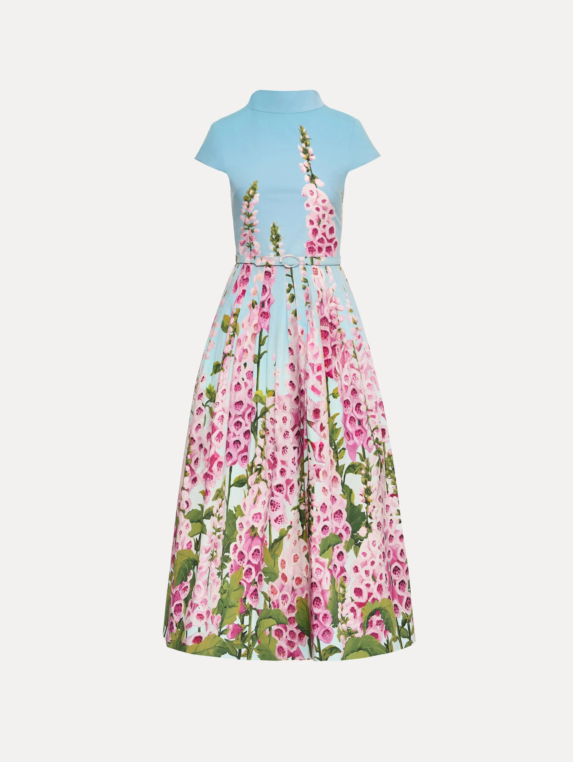 Cut from cotton poplin, this midi dress features a degrade foxglove print that blooms from hem to bodice. Defined by an open back with a trailing self-tie adorned in the same florals, its silhouette balances structured pleats with a sense of ease. Details - Cap Sleeves - Mock Neckline - Open Back with Self-Tie Closure - Coordinating, Removable Buckle Belt - Concealed Back Zipper - Side Seam Pockets - Unlined - Country of Origin: Italy - Style Code: 26RE210XCP_LLS Materials & Care - 97% Cotton, 3% Elastane - Spot clean only - Do not dry clean, iron, steam, bleach, or wash