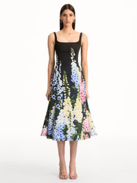 A fitted bodice opens to a flared skirt awash in degrade foxglove blooms, their cascading colors creating a striking sense of movement against the deep, inky ground. Details - Sleeveless - Square Neckline - Concealed Back Zipper - Country of Origin: Italy - Style Code: 26RN6352MOA_NVM Materials & Care - 100% Polyester - Dry clean only.