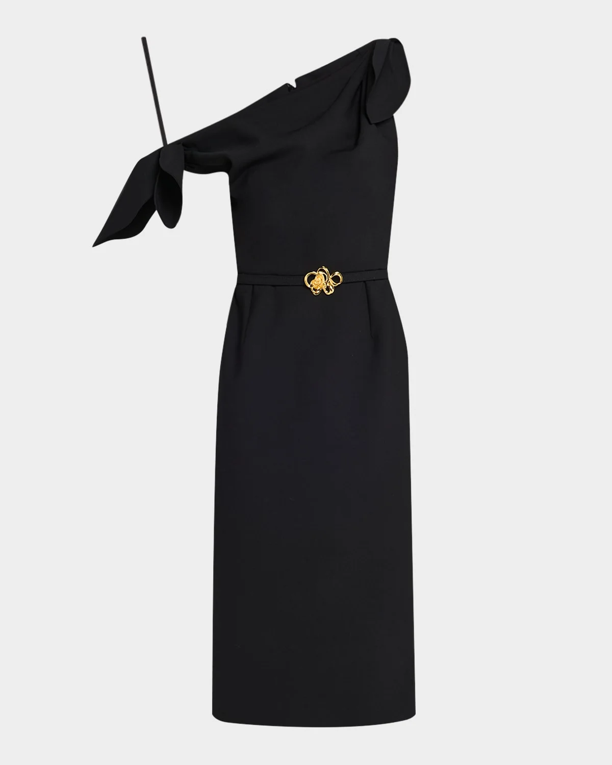 - Oscar de la Renta dress featuring a draped neck with shoulder ties and a belted waist with a golden swirl buckle - Off-the-shoulder neckline - Cap sleeves - Sheath silhouette - Knee length - Center-back vented hem - Invisible back zip - Virgin wool/polyester/elastane - Lining: Silk - Dry clean - Made in Italy