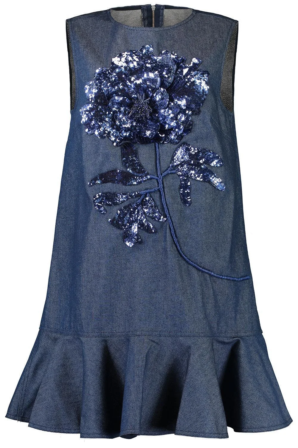 DETAILS AND INSIGHT Oscar De La Renta drop waist shift dress in dark denim. 99% Co 1% Ea; Binding: 100% Silk Dry Clean Made In Italy Ships By Oct. 7 Style 25FE215SDE-DDM