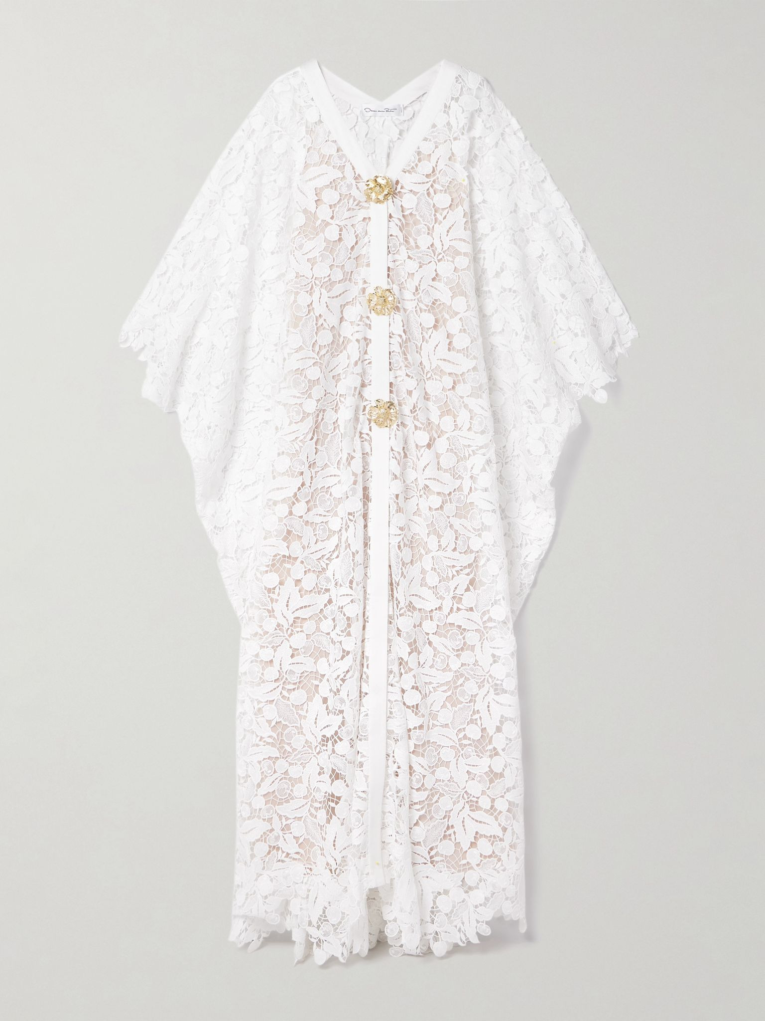 Oscar de la Renta's gown is made from pretty guipure lace - look closely and you'll see it features playful cherries instead of typical flowers. It's designed in a loose, kaftan-inspired shape and has a trio of gold-tone buttons shaped to depict flowers. The smooth silk lining offers plenty of coverage. Size & Fit - Fits true to size, take your normal size - Designed for a loose fit - Designed with a detachable, slim-fitting slip - Lightweight, non-stretchy fabric - Model is 177cm/ 5'10" and is wearing a size Small Details & Care - White guipure lace - Button fastenings through front - 100% polyester; lining: 100% silk - Dry clean