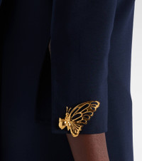 Oscar de la Renta's designs bring the beauty of nature to ready-to-wear. This full-length kaftan is made from a double-faced wool-blend and defined by a an open back with draped detailing and butterfly embellishments at the split sleeves. Product Details - Material: 94% wool, 5% elastane, 1% other fibres - Care instructions: dry clean - Made in Italy - Designer color name: Navy - Item color: blue - Hardware color: gold - Closure: hook-fastening back, buttoned back, concealed zipper, zipped back - Long vent - Item number: P01047984 Size & Fit - True to size - Low back - Straight fit - Non-stretchy fabric - slit length 63cm-25" - The model seen in the picture is 178cm-5'10" and wearing a size US 4