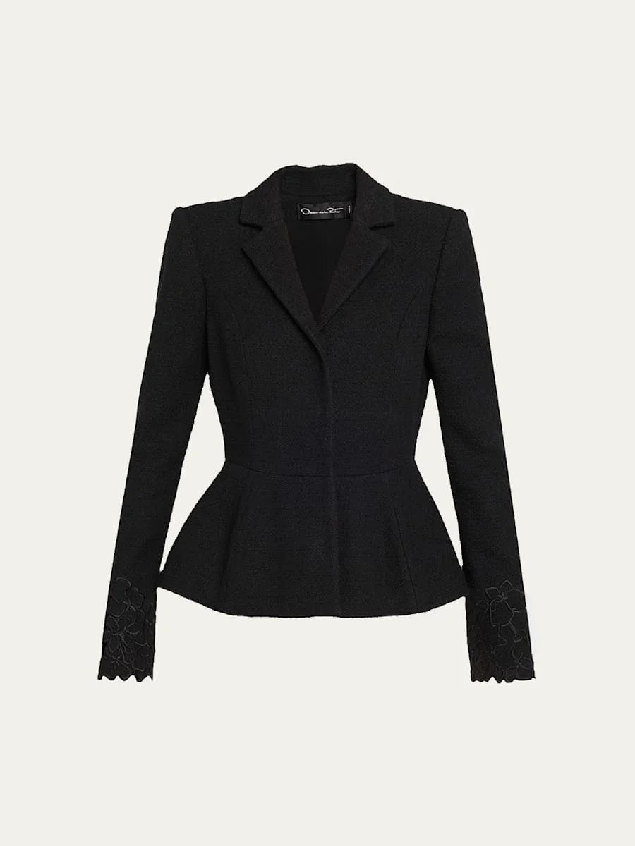 Oscar de la Renta boucle suit jacket featuring floral embroidered cutout cuff details and a peplum hem Notch lapels; single-breasted front Long sleeves Slim fit Flounce hem Concealed button closure Cotton/virgin wool/polyester Lining: Silk Dry clean Made in Italy Online Inquiries: BGS21_B9XF9| Store Inquiries: #4993492
