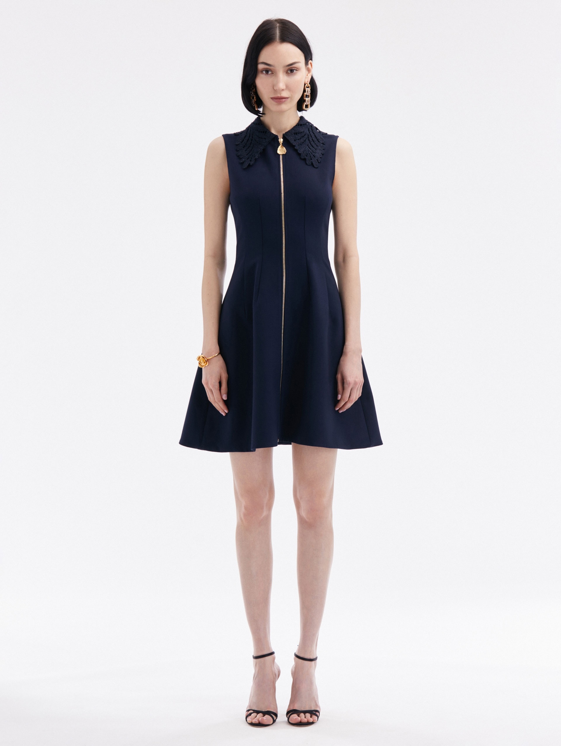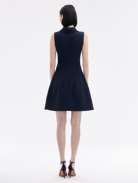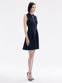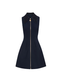 FEATURING A FERN EMBROIDERED SHIRT COLLAR AND A VERSATILE ZIP FRONT, THIS DRESS WILL ELEVATE YOUR EVERY DAY. SLEEVELESS / SHIRT COLLAR / ZIP FRONT / GOLD-TONE HARDWARE / KNEE LENGTH / UNLINED / DRY CLEAN DIMENSIONS: MODEL IS 5'10.5" / 180 CM AND WEARING SIZE 2 MATERIAL: 94% VIRGIN WOOL, 5% ELASTANE, 1% POLYAMIDE MADE IN ITALY STYLE 24PE216DSW_NAV