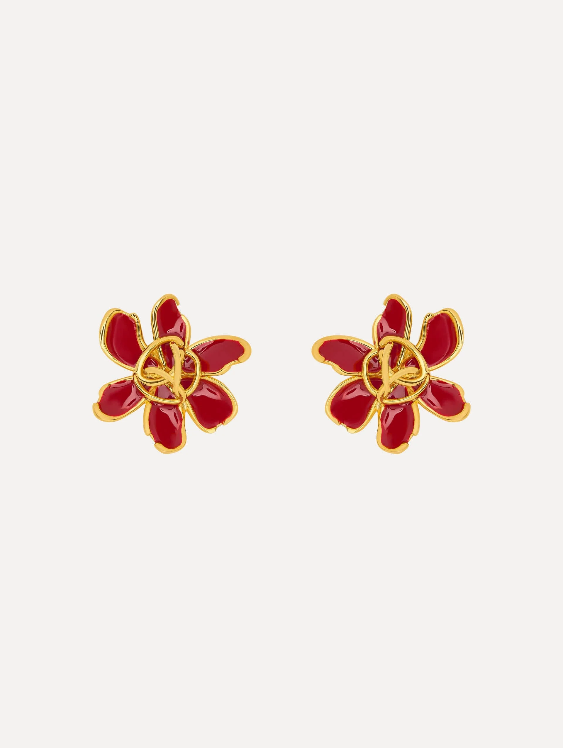 These enamel floral earrings hold a subtle surprise, with sculpted petals that echo the curves of the Oscar 'O' and a braided emblem at the center drawn from this season’s signature motif. Details - Dimensions: 34 mm x 36 mm - Weight: 16 grams - Post Backs / For Pierced Ears - Style Code: F25J933_BUR - Country of Origin: Italy Materials & Care - - 90% Brass, 10% Enamel - - Avoid exposing your jewelry to harsh chemicals. - - Lotions, cosmetics, hairspray and perfumes can cause chemical reactions that can cause the finish to deteriorate. - - Before handling, washing hands after applying makeup and hair products will help to preserve the finish. - - Do not wear in the pool, on the beach or in the shower. - - Wipe away dirt and body oils with a slightly damp microfiber jewelry cloth or cotton ball and allow to dry. - - Store separately in cloth pouches or small boxes to minimize scratching.
