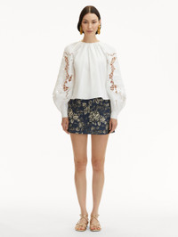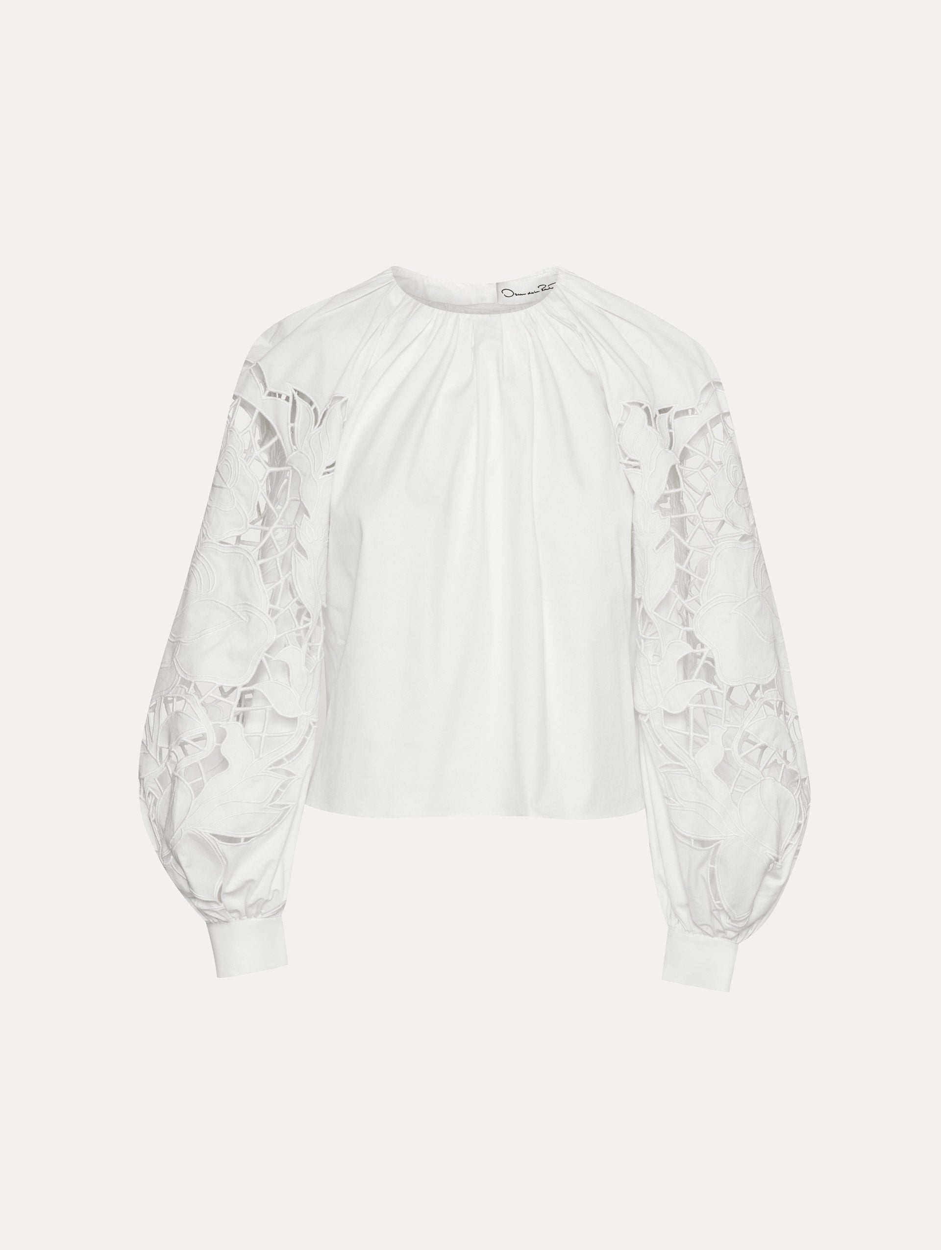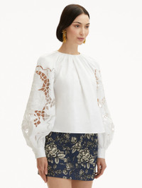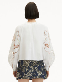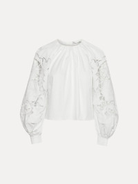 This balloon sleeve blouse offers a new iteration of this season's painterly English Rose motif. Climbing florals are realized through threadwork cutouts in cotton stretch twill. Details - Long Sleeves with Button Cuffs - Gathered Neckline - Pullover Style - Concealed Back Zipper - Relaxed Silhouette - Unlined - Style Code: 25SE731SRN_WHT - Country of Origin: India Materials & Care - 98% Cotton, 2% Elastane