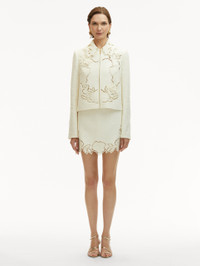 This jacket offers a new iteration of this season's painterly English Rose motif. Climbing florals are realized through threadwork cutouts in cotton wool tweed. Pair with the coordinating top and skirt. Details - Long Sleeves - Shoulder Pads - Shirt Collar - Zip Front - Gold-Tone Hardware - 100% Silk Lining - Style Code: 25SE511CWD_IVR - Country of Origin: Italy Materials & Care - 64% Cotton, 27% Virgin Wool, 9% Polyamide; Lining: 100% Silk