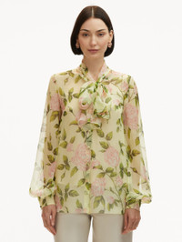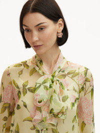This tie neck blouse is defined by the English Rose motif, a pillar of the Spring 2025 Collection. Cut of silk chiffon, this romantic blouse boasts a lighter-than-air construction. Details - Long Sleeves with Button Cuffs - Self-Tie Neckline - Button Front - Relaxed Silhouette - Shirt Tail Hemline - Cami - Style Code: 25SN736RSN_PGY - Country of Origin: Italy Materials & Care - 100% Silk