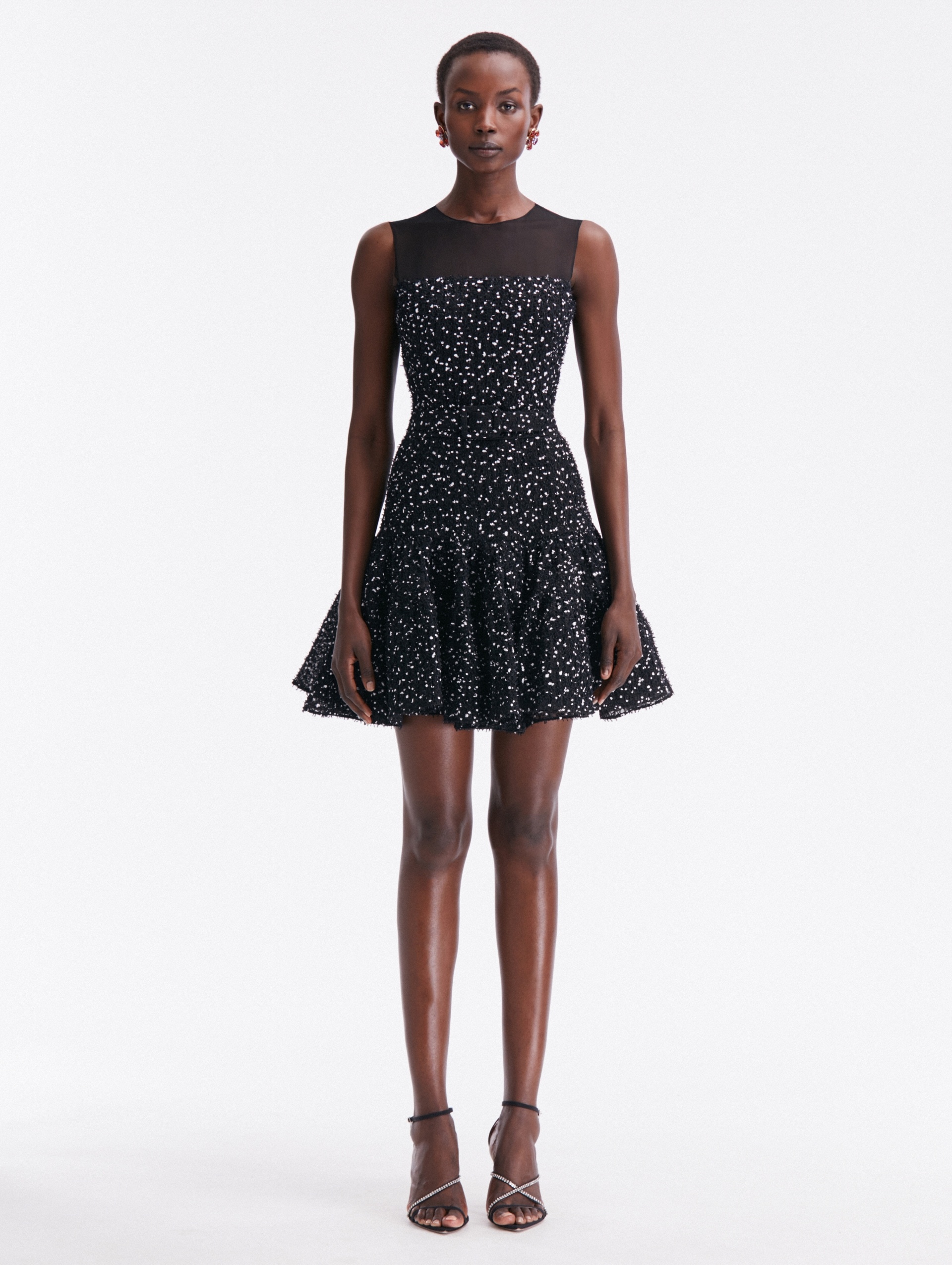 WITH AN EYELASH FIL COUPÉ BASE, THIS TIMELESS MINI DRESS BOASTS A SPECKLED FINISH. FEATURING AN ILLUSION YOKE AND FITTED BODICE, THIS SLEEVELESS STYLE WILL BE A GO-TO FAVORITE FOR YEARS TO COME. SLEEVELESS / ILLUSION NECKLINE / SLIM FIT / FLARE HEM / MID-THIGH LENGTH / BACK ZIPPER / 100% SILK LINING / DRY CLEAN DIMENSIONS: MODEL IS 5'10.5" / 180 CM AND WEARING SIZE 2 MATERIAL: 57% POLYAMIDE, 43% SILK; COMBO & LINING: 100% SILK MADE IN ITALY STYLE 24RN606PEF_BLW