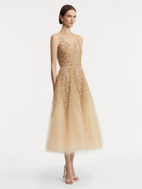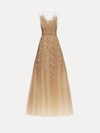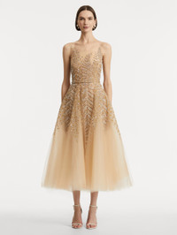 Ethereal and intricately detailed, this cocktail dress enchants with its illusion neckline and softly flared skirt. Delicate metallic fern embroidery shimmers against the illusion tulle base, creating a striking interplay of texture and light. Details - Sleeveless - Illusion Neckline - Keyhole Back Closure - Concealed Back Zipper - Internal Waistband with Hook-and-Bar Closure - Semi-Sheer - Lined - Style Code: 25FE643TUL_NUG - Country of Origin: USA Materials & Care - - 100% Polyamide; Layers: 100% Nylon; Lining: 100% Silk - - Spot clean only. - - Do not dry clean, iron, steam, bleach, or wash.