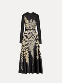 Crafted from silk mikado, this long-sleeve dress features a solid black base, brought to life with ecru ferns concentrated at the center. The striking placement creates a bold, botanical focal point. Details - Long Sleeves - Jewel Neckline - Removable, Coordinating Buckle Belt - Concealed Back Zipper - Lined - Style Code: 25FN650FMI_BCU - Country of Origin: Italy Materials & Care - - 46% Cotton 43% Viscose, 11% Silk; Lining: 100% Silk - - Dry clean only.