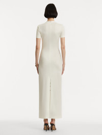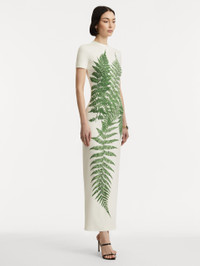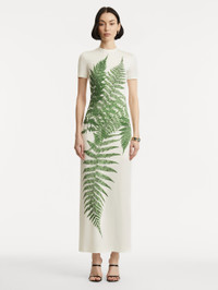 Crafted from soft jersey, this short-sleeve dress features a slim silhouette and a solid ivory base, brought to life with vibrant green ferns concentrated at the center. The striking placement creates a bold, botanical focal point. Details - Short Sleeves - Banded Collar - Slim Fit - Concealed Back Zipper - Center Back Slit - Unlined - Style Code: 25FN243FNY_GWI - Country of Origin: Italy Materials & Care - - 94% Viscose, 6% Elastane - - Dry clean only.
