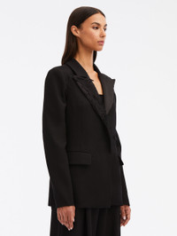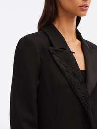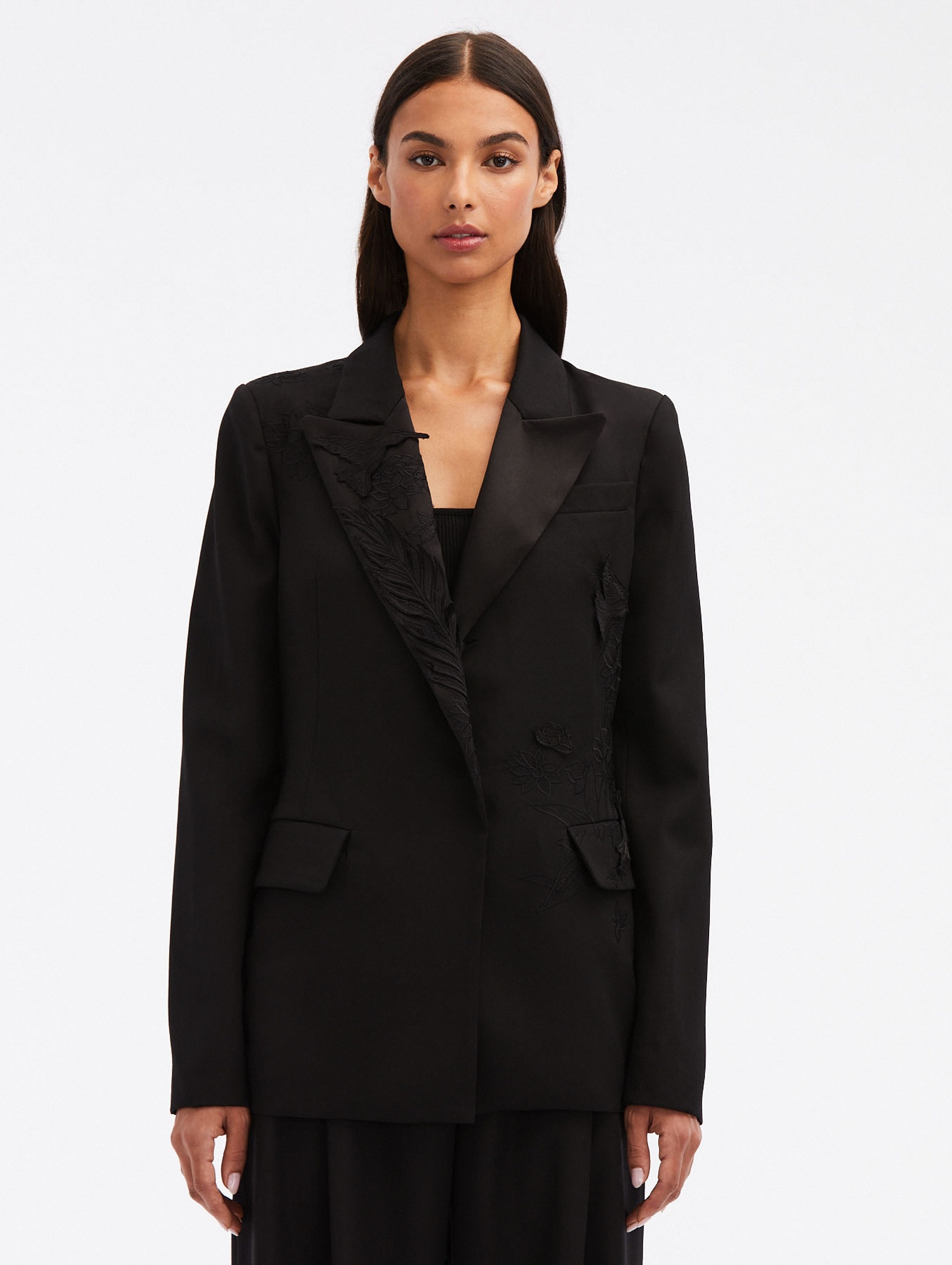 FEATURING PERFECTLY PLACED FLORA & FAUNA EMBROIDERY AT THE LAPEL AND WAIST, ITS TAILORED FIT AND POLISHED DETAILS WILL INSTANTLY MAKE THIS YOUR FAVORITE OVERLAYER. STYLE WITH THE COORDINATING PANT FOR A STATEMENT SURE TO STUN. LONG SLEEVES / NOTCH LAPELS / TAILORED FIT / FRONT FLAP POCKETS / CHEST WELT POCKET / DOUBLE VENT / 100% SILK LINING / DRY CLEAN DIMENSIONS: MODEL IS 5'10.5" / 180 CM AND WEARING SIZE 2 MATERIAL: 100% VIRGIN WOOL; LINING: 100% SILK MADE IN USA STYLE 24SE513GPO_BLK