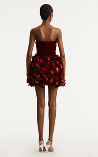 PRODUCT DETAILS - Strapless, floral appliqued, velvet bodice ruched, mini hem - Concealed zip fastening - Lined - Composition: Base 100% Polyamide; Self: 98% Cotton, 2% Elastane; Lining 100% Silk - Color: Terracotta - Dry clean only - Fall/Winter '25