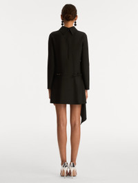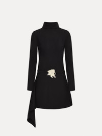 This long-sleeve mock neck dress is tailored from double-faced stretch wool with sharp, minimal lines. A slim belt highlights the waist, finished with a dimensional floral detail that adds a refined accent to the clean silhouette. Details - Long Sleeves - Mock Neckline - Coordinating Novelty Belt - Concealed Back Zipper - Unlined - Country of Origin: Italy - Style Code: 26RN224DSW_BLK Materials & Care - 94% Virgin Wool, 5% Elastane, 1% Polyamide - Dry clean only.