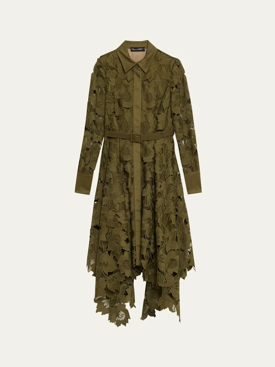 Embroidered with floral detailing, this shirtdress by Oscar de la Renta features an asymmetric handkerchief hem Spread collar; button front Long sleeves; button cuffs Belted waist Hem falls below the knee Polyester Lining: Silk Dry clean Made in Italy