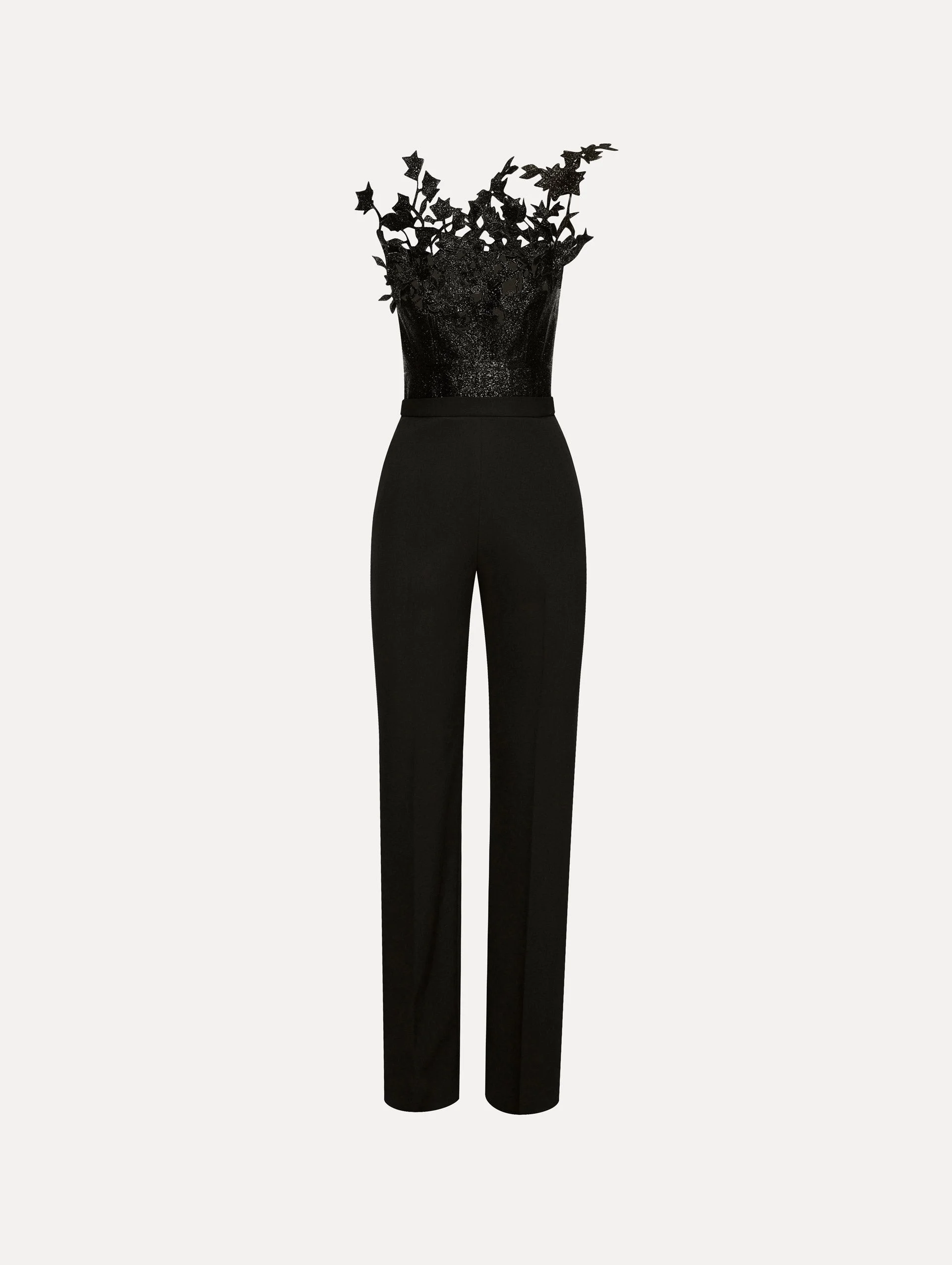 Elegance takes form in this black metallic threadwork jumpsuit, where shimmering embroidery meets exquisite craftsmanship. Delicate three-dimensional cherry blossom appliques bloom across the bodice, adding depth and romance to the statuesque design. Details - Strapless - Straight Leg Silhouette - Concealed Back Zipper - Internal Bustier - Unlined - Style Code: 25PE308SWG_BAK - Country of Origin: USA Materials & Care - 100% Silk; Self: 98% Wool, 2% Elastane