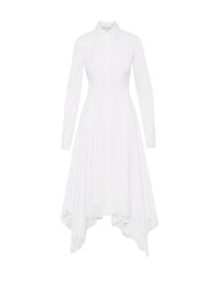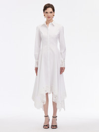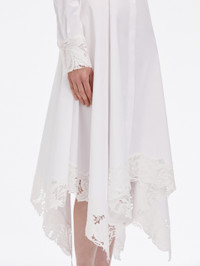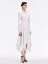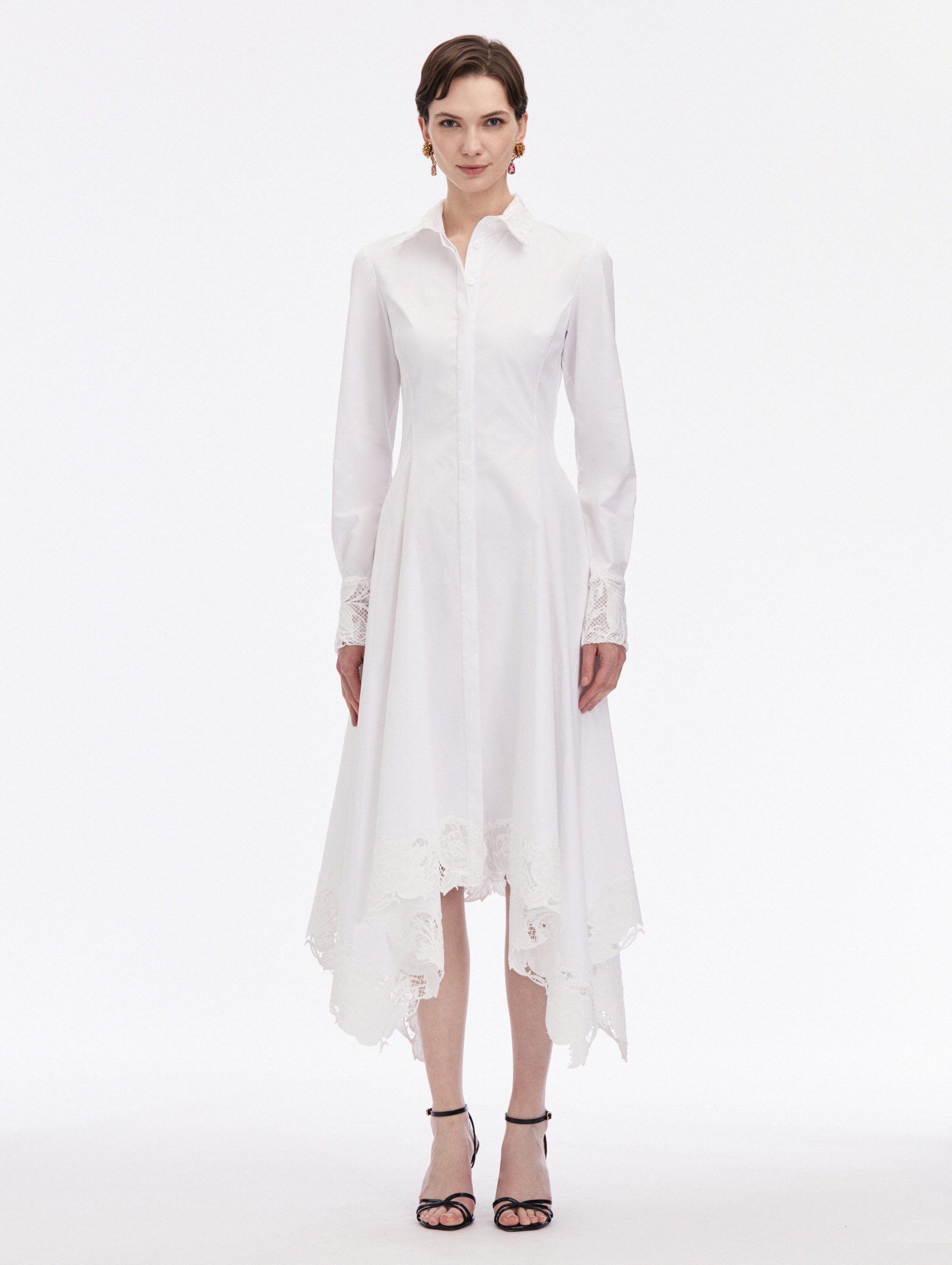 WITH FLORAL GUIPURE LACE TRIM, THIS MIDI DRESS FEATURES A DIMENSIONAL HANDKERCHIEF HEM THAT SWISHES WITH EVERY STEP. LONG SLEEVES WITH BUTTON CUFFS / SHIRT COLLAR / CONCEALED BUTTON FRONT / ASYMMETRICAL HEMLINE / BELOW THE KNEE LENGTH / LINED / DRY CLEAN DIMENSIONS: MODEL IS 5'10.5" / 180 CM AND WEARING SIZE 2 MATERIAL: 98% COTTON, 2% ELASTANE; LACE: 100% POLYESTER; LINING: 100% COTTON MADE IN USA STYLE 24FN210SRN_WHT