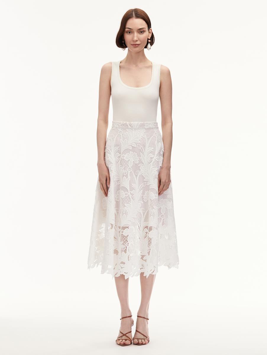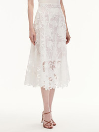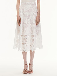 THIS MIDI SKIRT OFFERS A NEW ITERATION OF THIS SEASON'S EXPLORATION OF ARTISANAL MARBLING TECHNIQUES. CRAFTED FROM MARBLED CARNATION GUIPURE LACE, THIS SKIRT SHOWCASES A FEMININE FULL SILHOUETTE. HIGH WAISTED / BANDED WAIST / BELOW THE KNEE LENGTH / CONCEALED SIDE ZIPPER / SEMI-SHEER / 100% SILK LINING / DRY CLEAN DIMENSIONS: MODEL IS 5'10.5" / 180 CM AND WEARING SIZE 2 MATERIAL: 100% POLYESTER; LINING: 100% SILK MADE IN ITALY STYLE 24PN421MCR_WHT