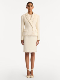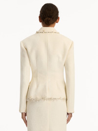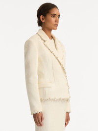 Tailored with sculptural precision, this jacket transforms classic suiting into a work of ornamented elegance. Its softly textured surface is traced with an embroidered trim, where delicate mother-of-pearl florals and light-catching crystals convene to frame the silhouette. Details - Long Sleeves - Notched Lapels - Single-Breasted with Concealed Button Closure - Front Flap Pockets - Single Vent - 100% Silk Lining - Country of Origin: Italy - Style Code: 26RE508CWD_IVR Materials & Care - 64% Cotton, 27% Virgin Wool, 9% Polyamide; Lining: 100% Silk - Spot clean only - Do not dry clean, iron, steam, bleach, or wash