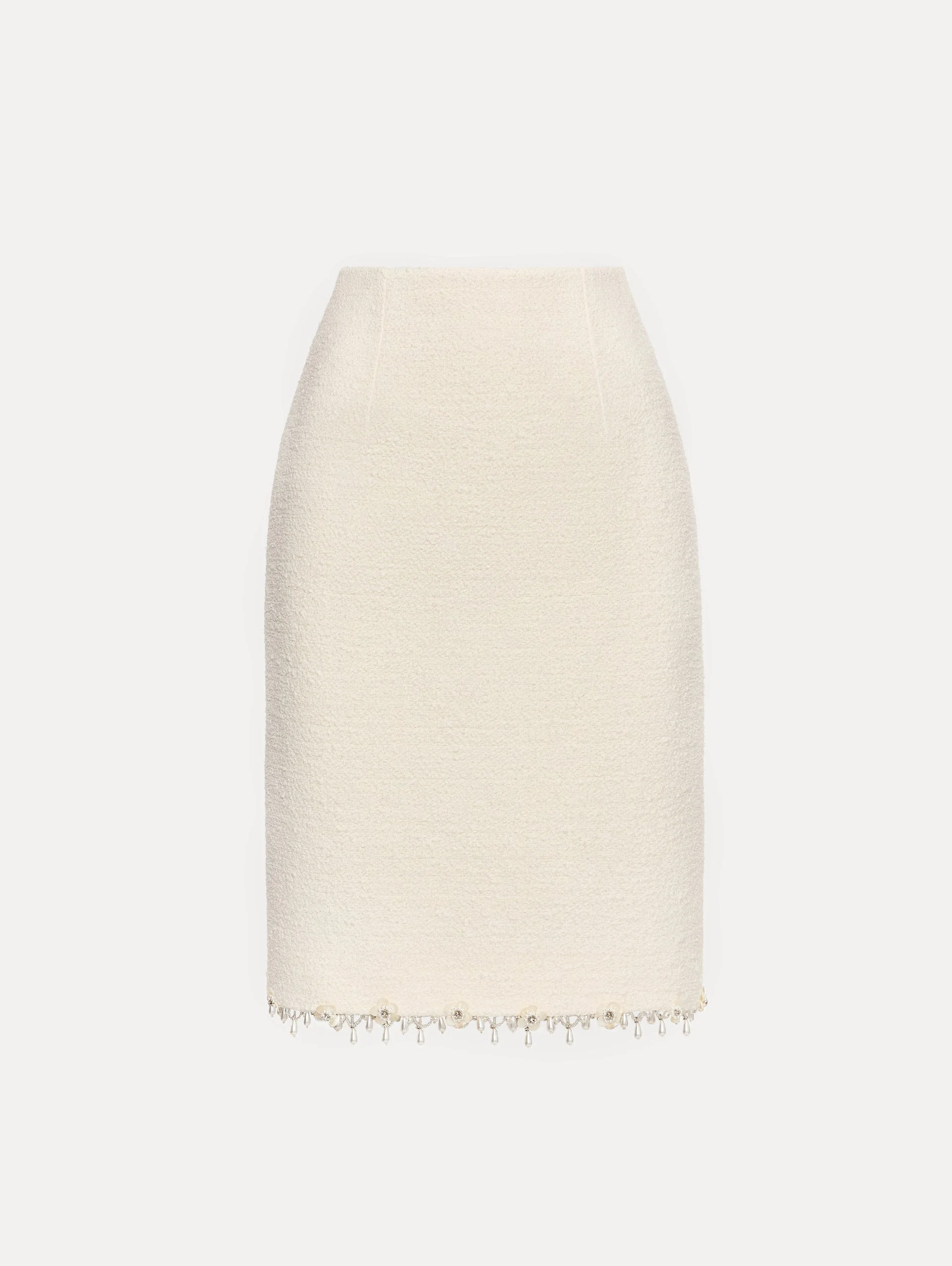 Tailored with sculptural precision, this skirt transforms classic suiting into a work of ornamented elegance. Its softly textured surface is traced with an embroidered trim, where delicate mother-of-pearl florals and light-catching crystals convene to frame the silhouette. Details - High Waisted - Banded Waist - Concealed Back Zipper - 100% Silk Lining - Country of Origin: Italy - Style Code: 26RE401CWD_IVR Materials & Care - 64% Cotton, 27% Virgin Wool, 9% Polyamide; Lining: 100% Silk - Spot clean only - Do not dry clean, iron, steam, bleach, or wash