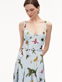 Work this season's slipper orchid motif into everyday looks with this cady dress that boasts a paneled construction which falls to a skirt of contrasting silk chiffon pleats that swish with every step. Details - Sleeveless - V-Neckline - Below the Knee Length - Removable, Coordinating Buckle Belt - Concealed Side Zipper - 100% Silk Lining - Style Code: 25RN236OCD_LBM Materials & Care - 92% Polyester, 8% Elastane; Combo: 100% Poyester; Lining: 100% Silk