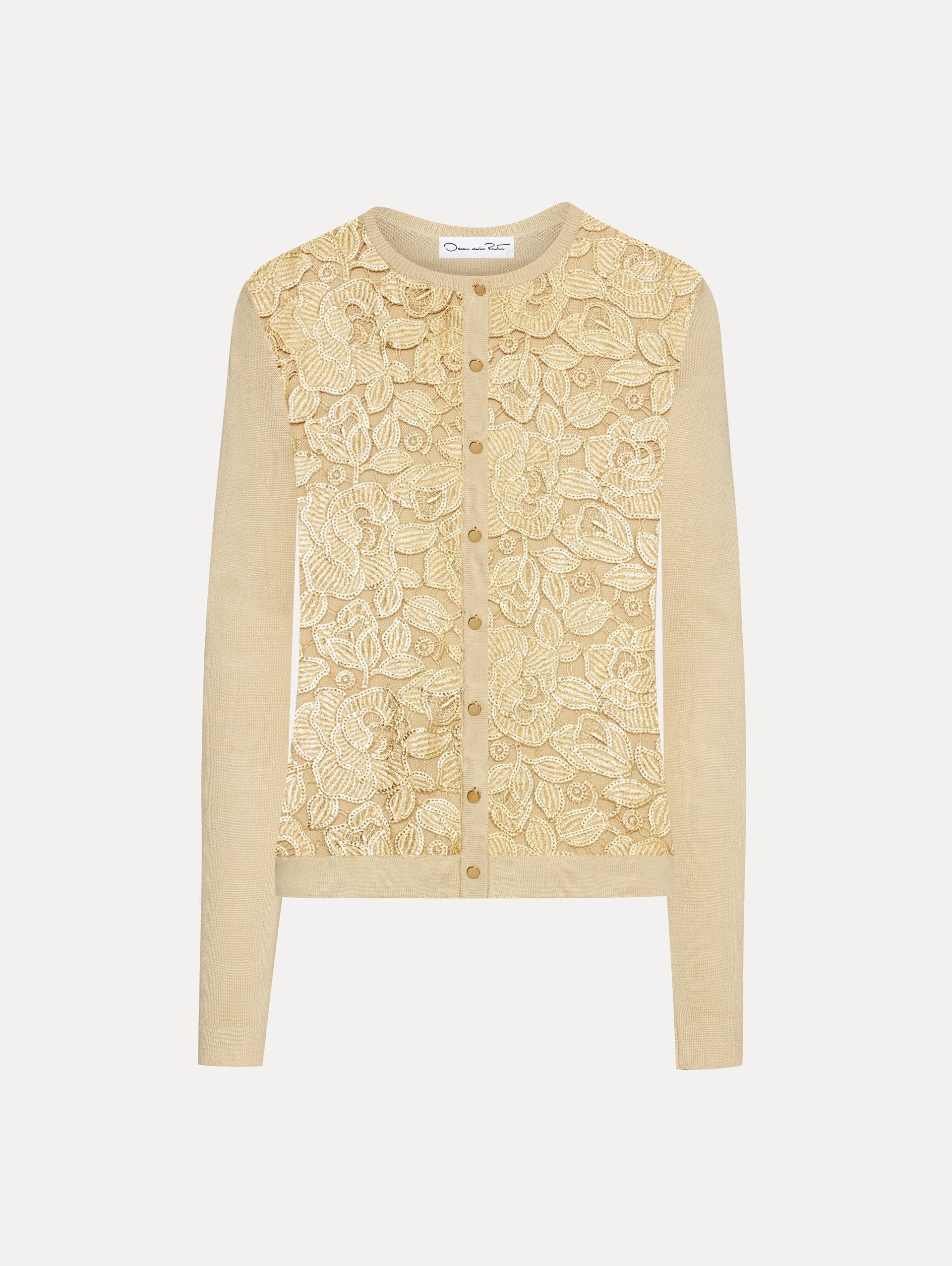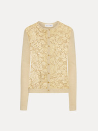 This timeless overlayer features an English rose guipure lace paneled front with gold edge detailing. This button-front cardigan is a perfect pairing for color-complementary separates or its coordinating tank for optimal versatility. Details - Long Sleeves - Crew Neckline - Button Front - Slim Fit - Hip Length - Ribbed Trim - Unlined - Style Code: 25SN155GFI_LBE - Country of Origin: Italy Materials & Care - 55% Silk, 45% Viscose