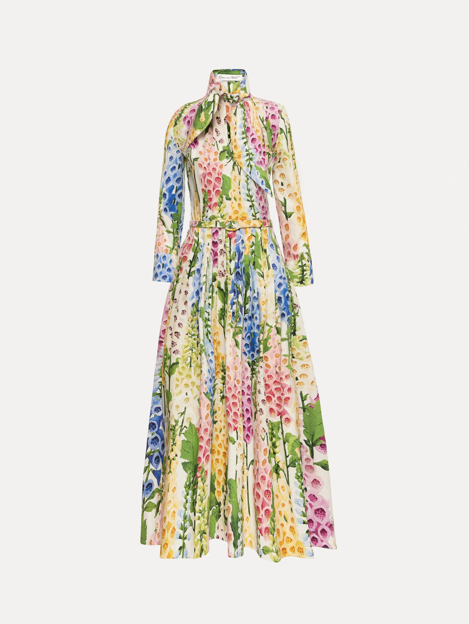 Tailored from crisp cotton poplin, this dress blooms with a vivid foxglove print that sweeps across its fitted bodice and pleated midi skirt. A soft bow frames the neckline, while three-quarter sleeves add a refined finish to its feminine silhouette. Details - Three-Quarter-Length Sleeves with Button Cuffs - Self-Tie Neckline - Removeable, Coordinating Buckle Belt - Side Seam Pockets - Concealed Side Zipper - Unlined - Country of Origin: Italy - Style Code: 26RN229FXC_WMU Materials & Care - 97% Cotton, 3% Elastane - Dry clean only.