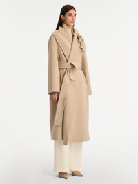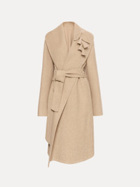 Tailored in soft wool, this wrap coat is defined by a sweeping silhouette that drapes with effortless elegance. At the neckline, a sculptural foxglove-inspired tendril unfurls in delicate embroidery, lending a touch of poetic detail to its clean, modern lines. Details - Long Sleeves - Shawl Collar - Open Front with Self-Tie Sash - Side Seam Pockets - Country of Origin: Italy - Style Code: 26RE8022BDH_OAT Materials & Care - 95% Cashmere, 4% Wool, 1% Silk - Spot clean only - Do not dry clean, iron, steam, bleach, or wash