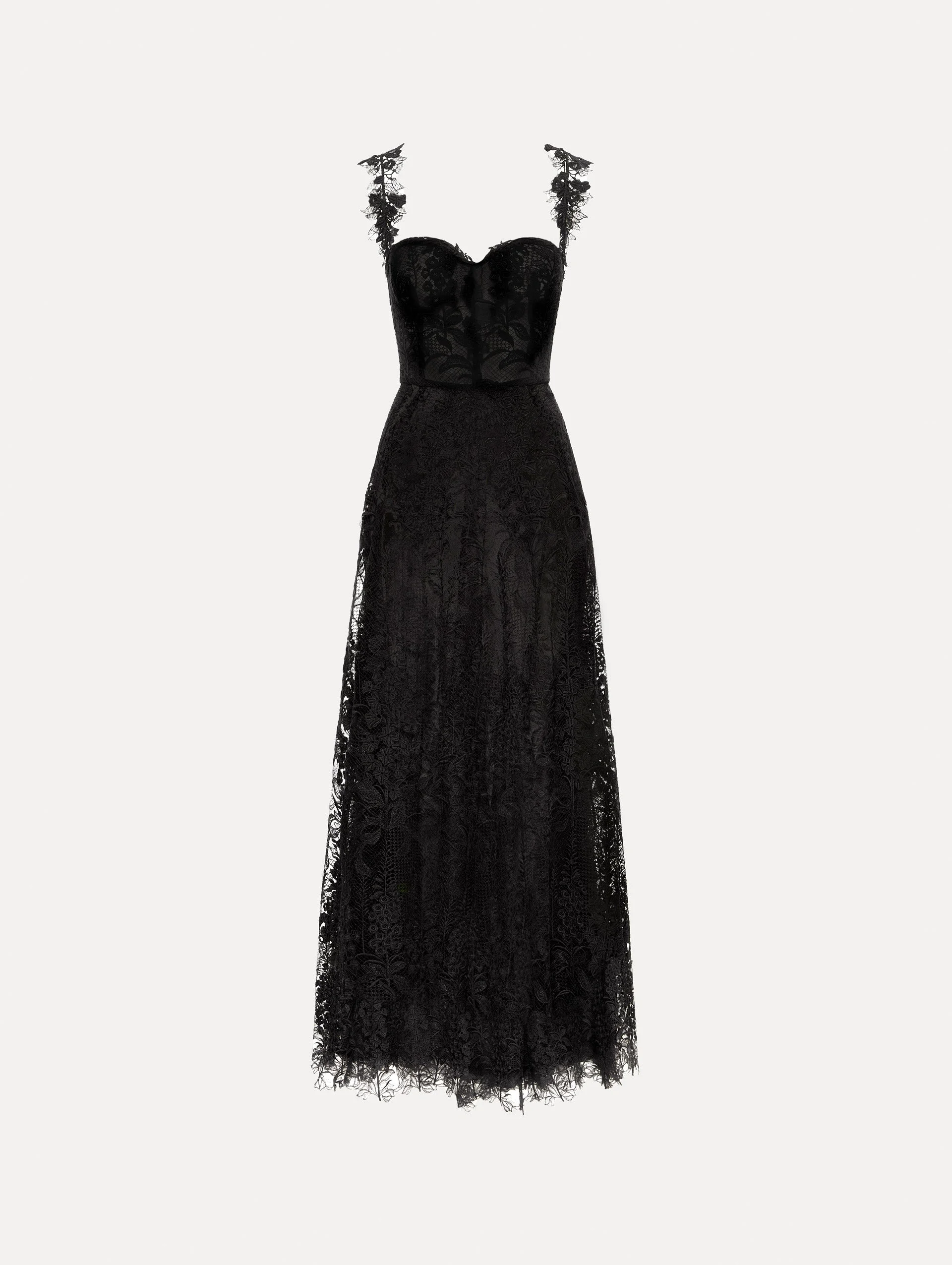 Foxglove guipure lace is sculpted into a form-fitting bodice and flowing skirt, enriched with threadwork appliques. Delicate straps and an intricately scalloped neckline frame the decollete, while a sheer underlay lends depth to the artistry. Details - Sleeveless - Sweetheart Neckline - Concealed Back Zipper - 100% Silk Lining - Country of Origin: Italy - Style Code: 26RN642FXG_BLK Materials & Care - 100% Polyester; Linings: 100% Silk - Dry clean only.