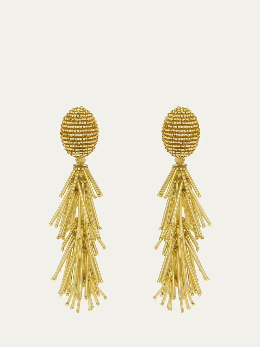 Glass seed beads and long tubular beads are strung together for these Oscar de la Renta fringe earrings. Approx. 3.5" length 24-karat gold-plated brass Glass beads, polyester, and PVC sequins Clip-on backs Imported Online Inquiries: BGS21_Y7NBA| Store Inquiries: #5039176