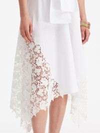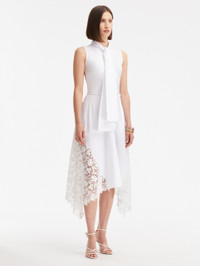 PERFECTLY PLACED GARDENIA LACE INSETS DEFINE THIS SHIRTDRESS. FASHIONED FROM CRISP COTTON POPLIN WITH A SELF-TIE NECKLINE AND HANDKERCHIEF HEM, THIS PIECE WILL ELEVATE YOUR EVERYDAY. SLEEVELESS / SELF-TIE NECKLINE / REMOVEABLE, COORDINATING BELT / HANDKERCHIEF HEMLINE / LINED / DRY CLEAN DIMENSIONS: MODEL IS 5'10.5" / 180 CM AND WEARING SIZE 2 MATERIAL: 98% COTTON, 2% ELASTANE; COMBO: 100% POLYESTER; LINING: 100% COTTON MADE IN ITALY STYLE 24RN259SRN_WHT