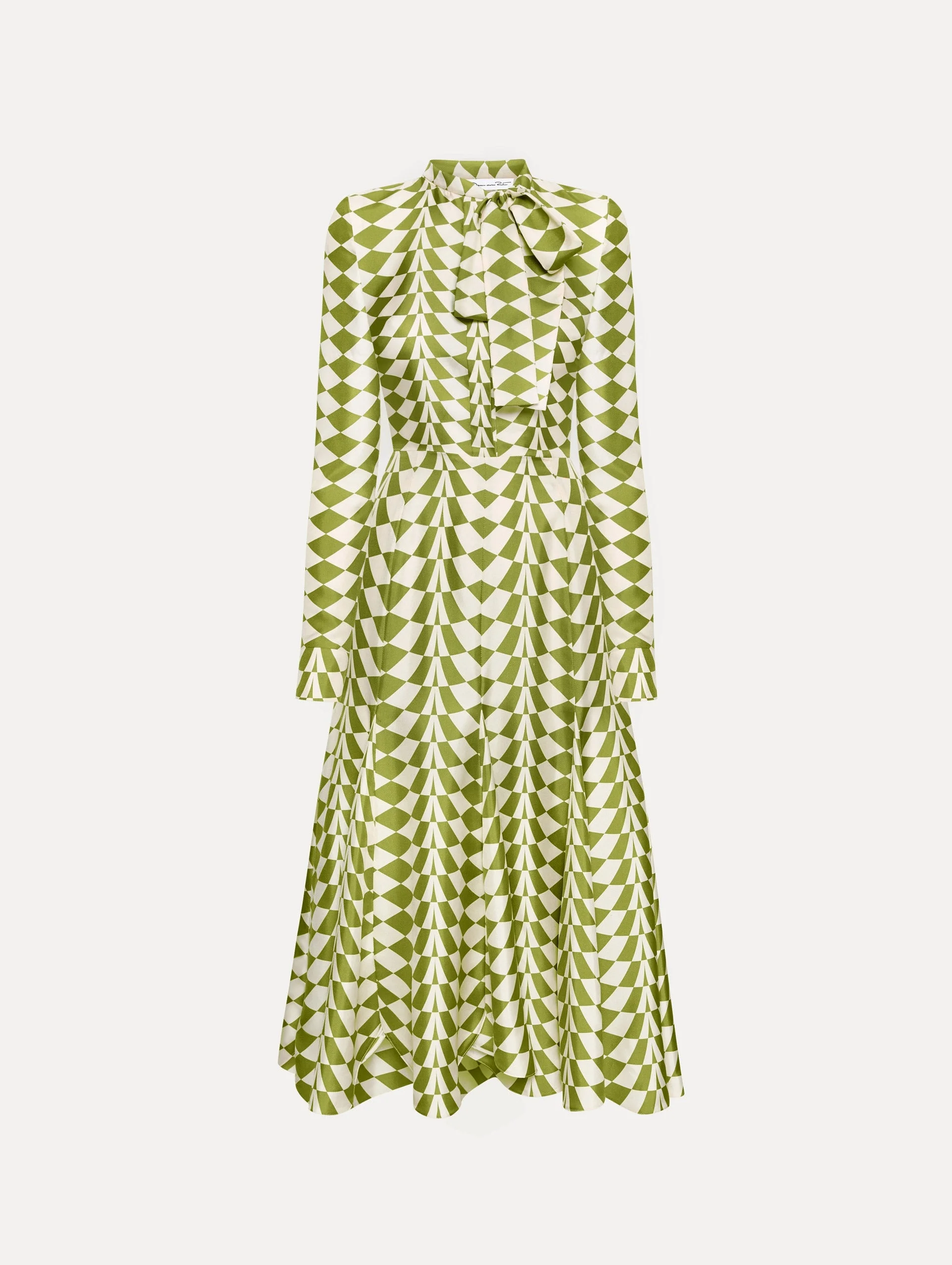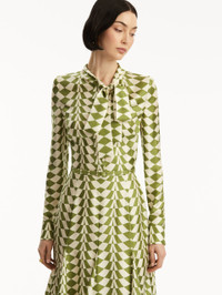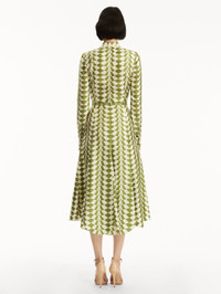 This silk twill dress features a kaleidoscopic geometric print, updating the classic silhouettes with a bold, contemporary twist. Featuring long sleeves and a concealed button front, this tyle is perfect for modern, everyday style. Details - Long Sleeves with Button Cuffs - Banded Collar with Self-Tie Closure - Concealed Button Front - Concealed Side Zipper - Pullover Style - Removable, Coordinating Buckle Belt - Unlined - Style Code: 25PN209GHS_FIV - Country of Origin: Italy Materials & Care - 100% Silk